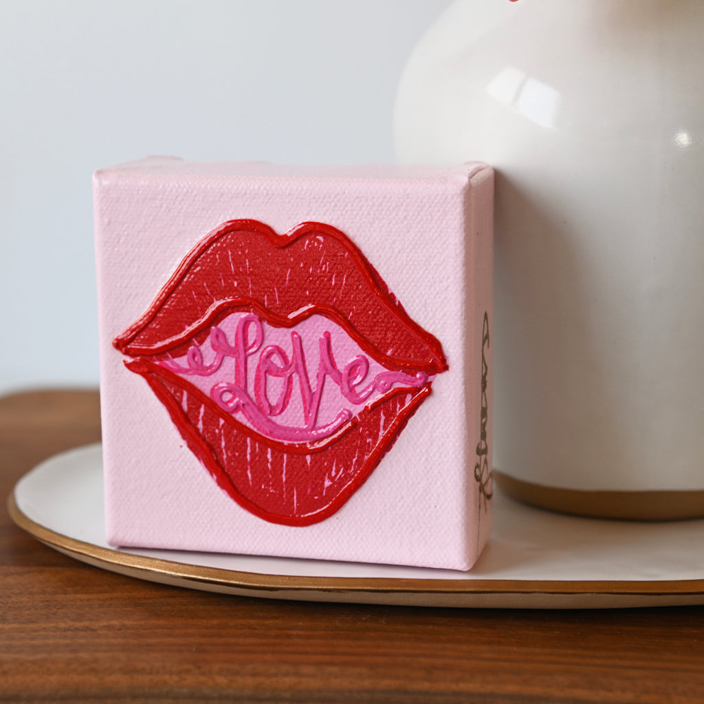 Bring love into your home with this Love Lips Canvas! This Valentine's decor measures 4"x4", perfect for adding a touch of romance to any room. Display it as a reminder of the love in your life or give it as a gift to someone special. Add some love to your space today!