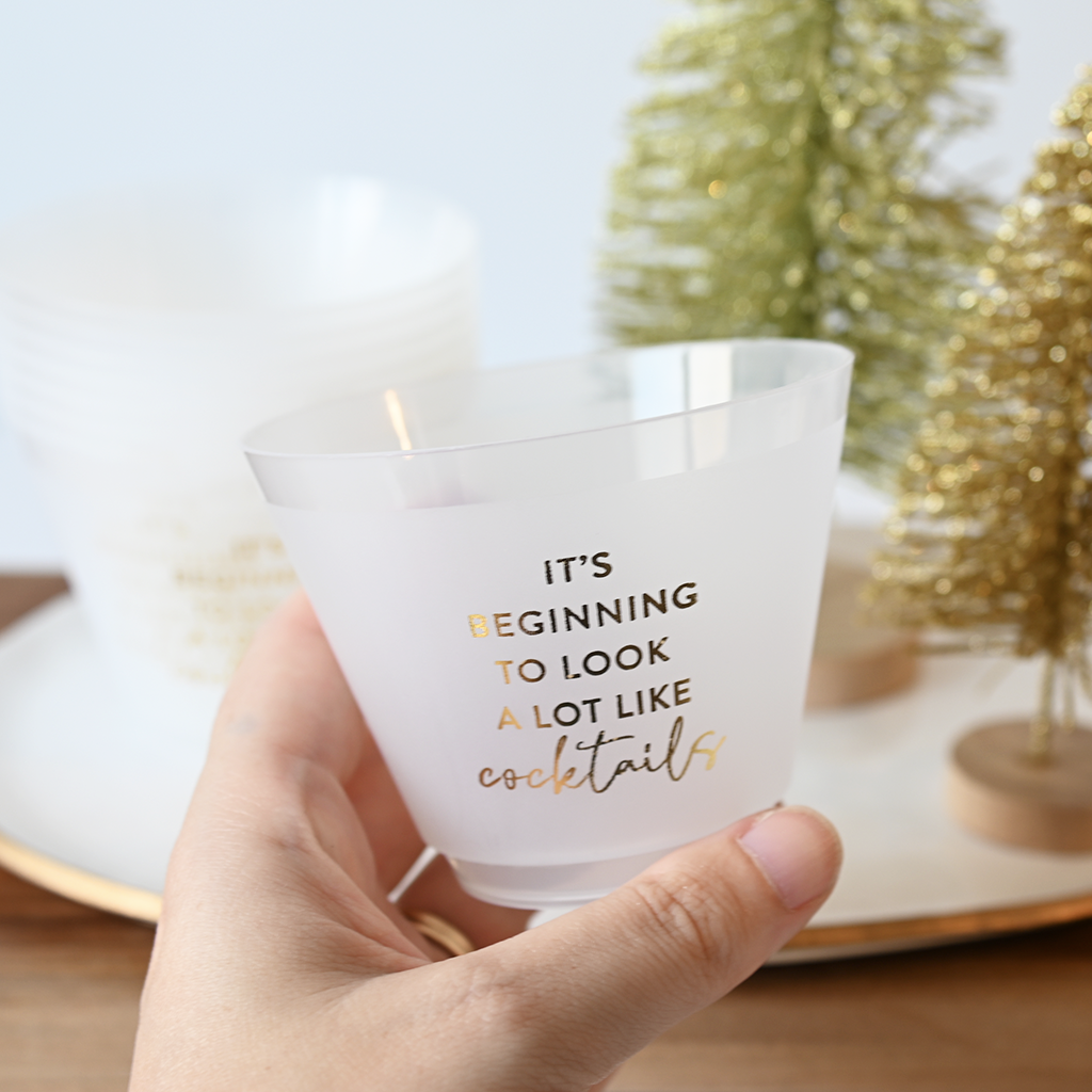 These Beginning to Look Frosted Wine Cups hold approximately 6 oz of your favorite beverage or cocktail, offering the perfect size for enjoying wine or mixed drinks. Their frosted design adds an elegant touch while providing a comfortable grip, making them ideal for both casual and formal occasions. Durable and stylish, these cups enhance your drinking experience with the right balance of capacity and sophistication.
