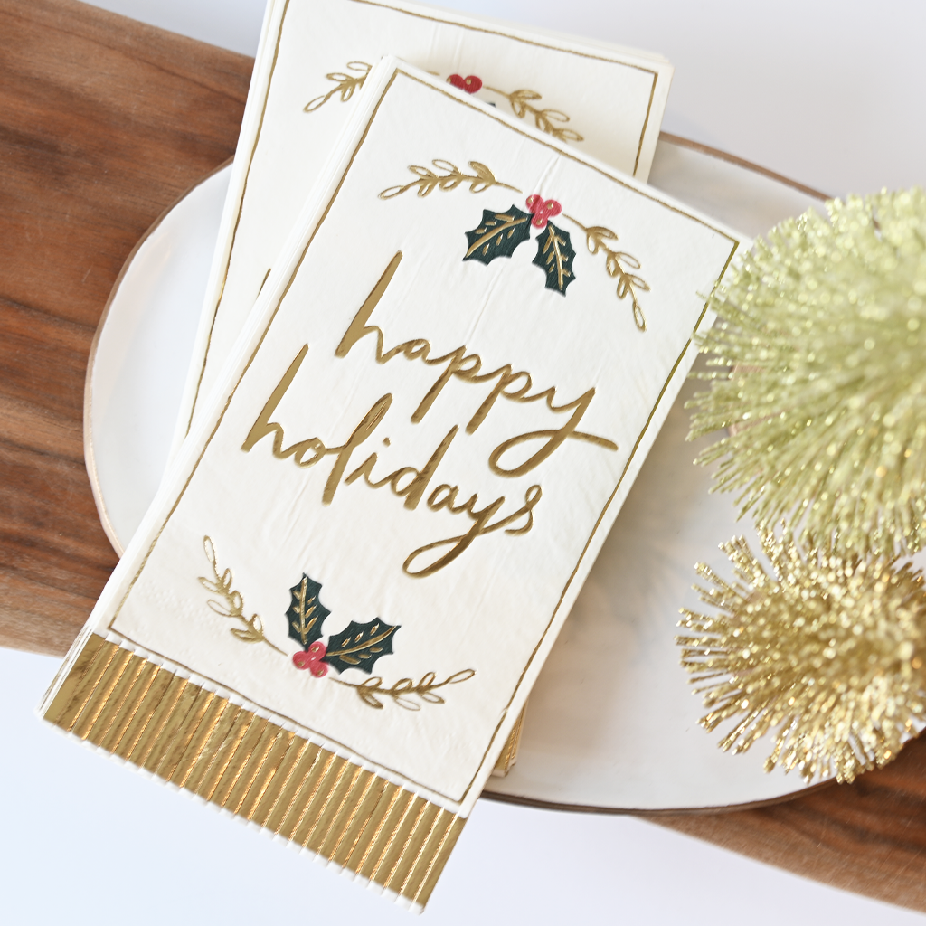These Happy Holidays Guest Napkins are ideal for adding a festive touch to your holiday gatherings. Each pack includes 20 guest towels, measuring 4.25" x 8", perfectly sized for bathroom use or enhancing the dining table setting. Their convenient size and quality make them both practical and stylish for seasonal entertaining.