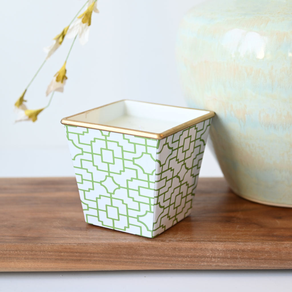 These mini cachepot candles are multiuse! When the wax has burned out, upcycle the pot into a planter or anything else you can think of! Hand-poured candles with one pound of wax for a long burn time. Container is 4" both tall and wide and is 3" wide at the base.