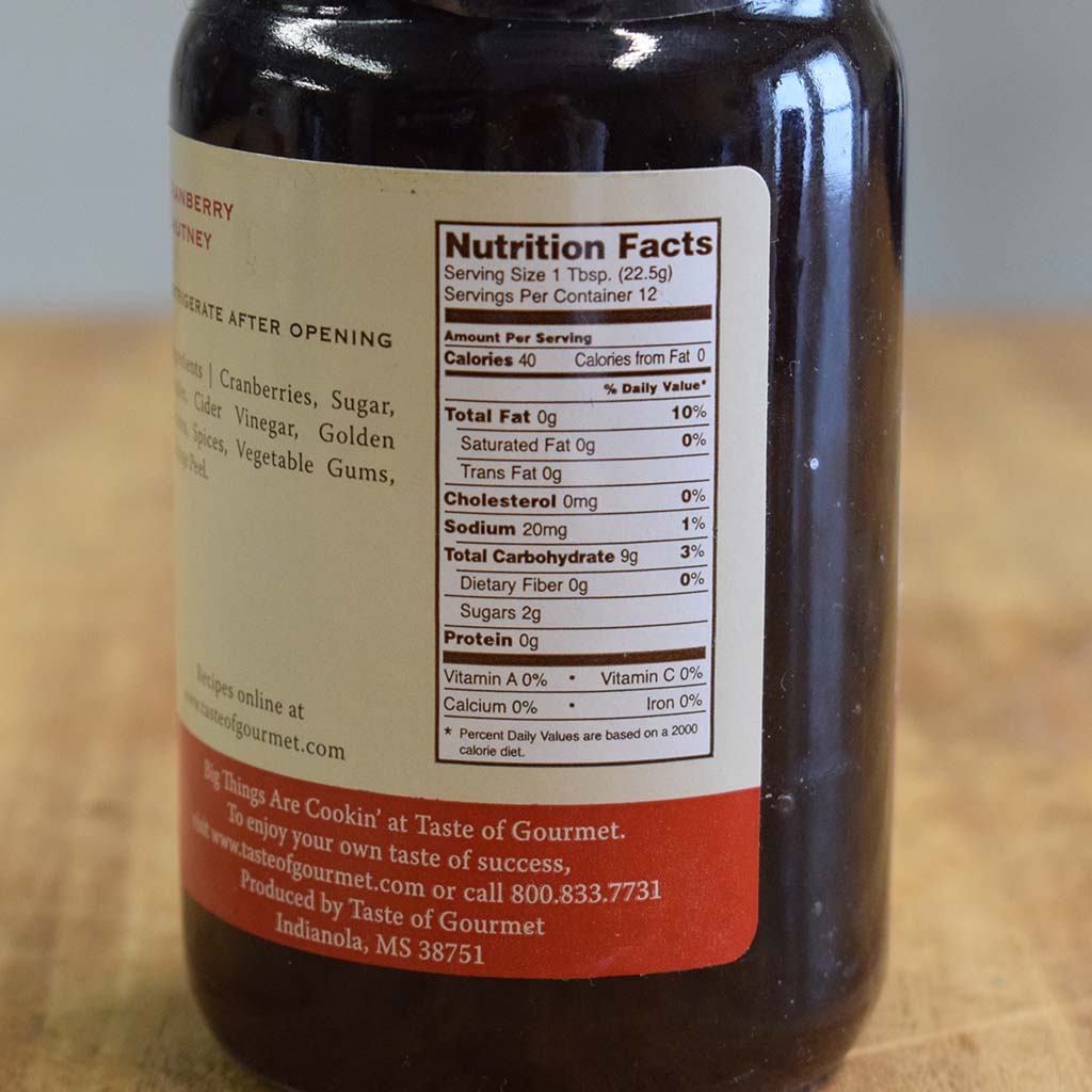 Ingredients: Cranberries, Sugar, Apples, Cider Vinegar, Golden Raisins, Spices, Vegetable Gums, Orange Peel.