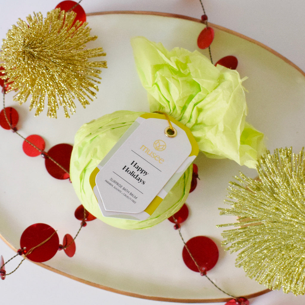 'Tis the season to be holly and jolly to make your bath festive and rejuvenating. Reminisce about holiday traditions as scents of winter vanilla and cashmere fill the room. Enjoy a relaxing bath with this Happy Holidays bath balm and find a wonderful snowflake treasure on the inside!