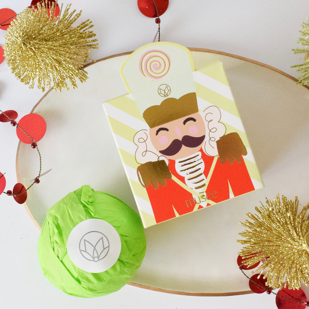 Dream big this season as this Nutcracker bath balm brings a little magic to your bathtub with vibrant colors of festive green and icy blue. Enjoy the lively scents of a candy cane and vanilla as you treat yourself to a warm bath.