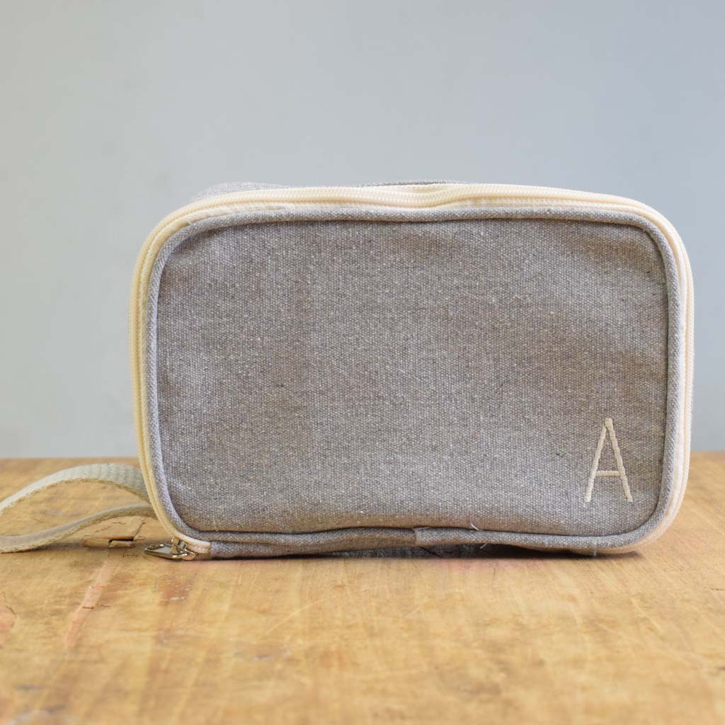 Made from recycled mixed materials, these bags are small enough to fit in an oversized tote and large enough to hold all of your toiletries. Embroidered monograms give the bag a unique and stylish look. Zipper closure. Makes a great graduation or birthday gift!