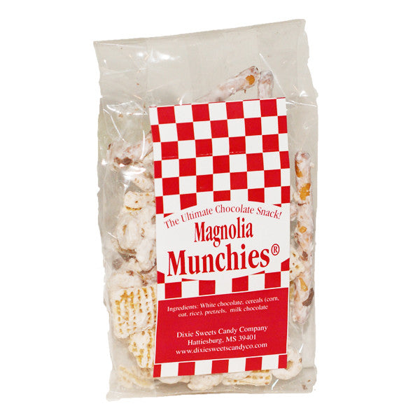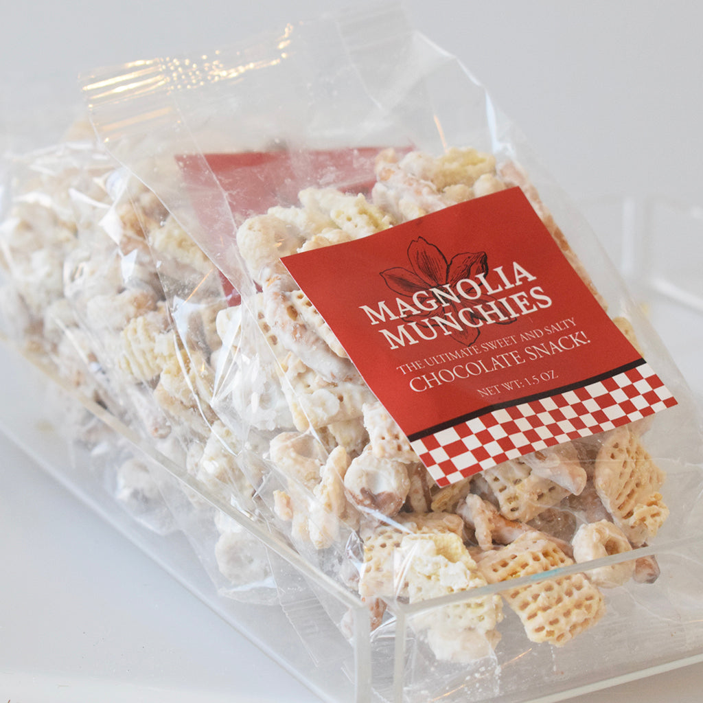 Trash mix dipped in white chocolate and drizzled with white chocolate. 1.5 oz bag.