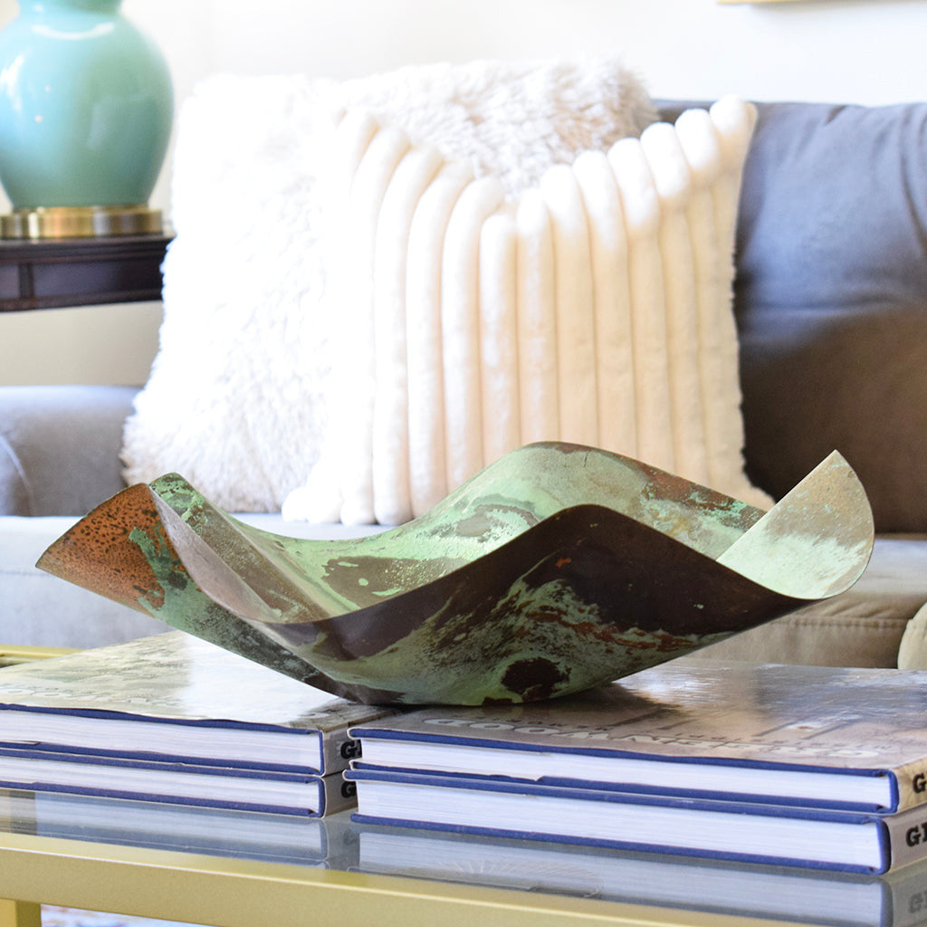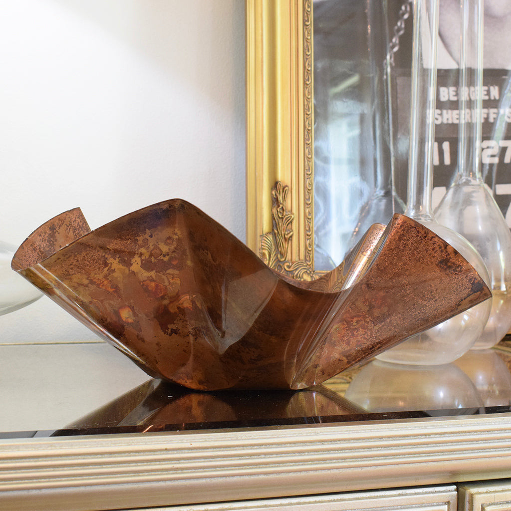 This striking wavy bowl makes a wonderful centerpiece or outdoor accent piece. At its widest point it measures approximately 16". The bowl is available in the classic copper and makes a wonderful housewarming gift.