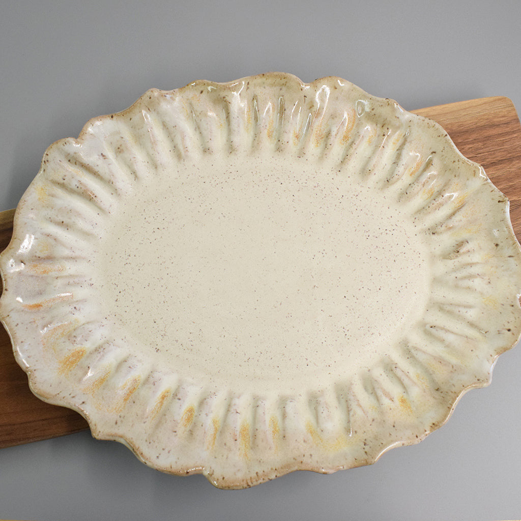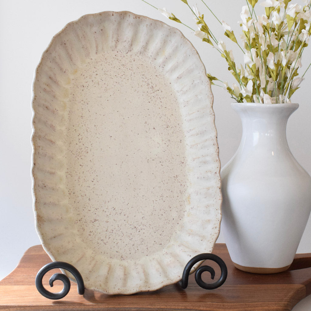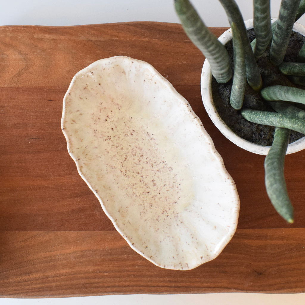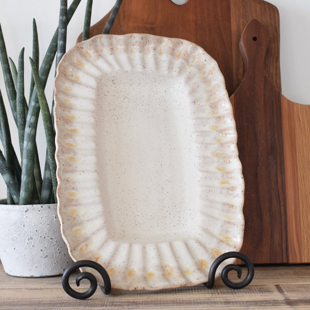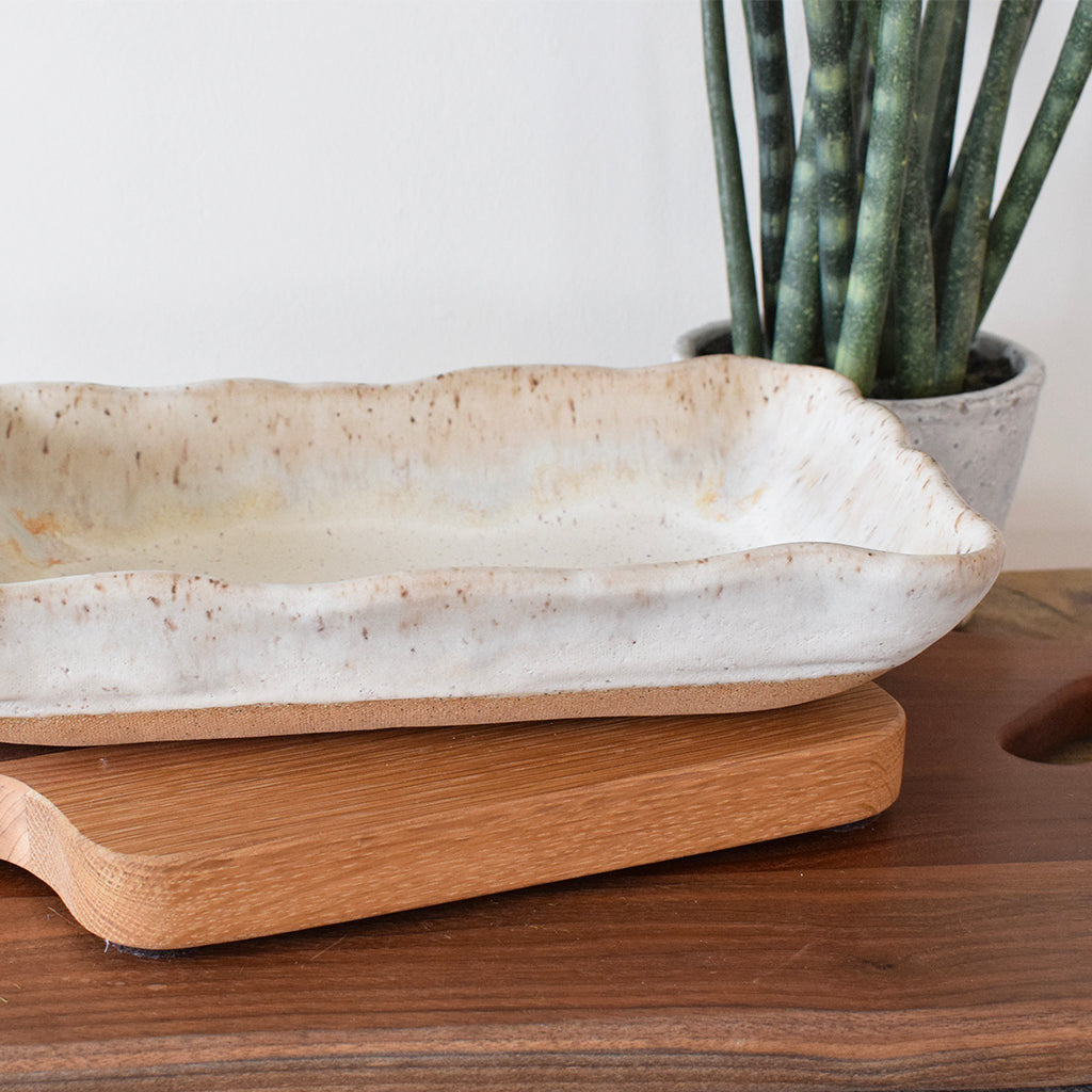 The Dogwood glaze from Etta B Pottery features a beautiful blend of beige, off white, & ivory tones. The matte glaze on the lower portions of each piece are a wonderful cream color & the glossy glaze around the edges are a perfect blend of ivory, light brown, off white, & sometimes you can even find a hint of a rust/orange color. The neutrality of this glaze is truly gorgeous! We believe that this glaze pairs best with pieces from the Hydrangea or Peaceful collection.