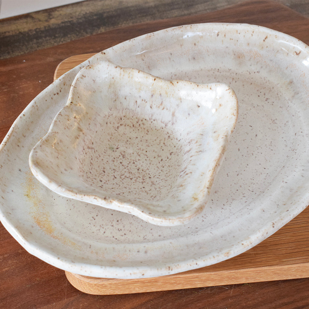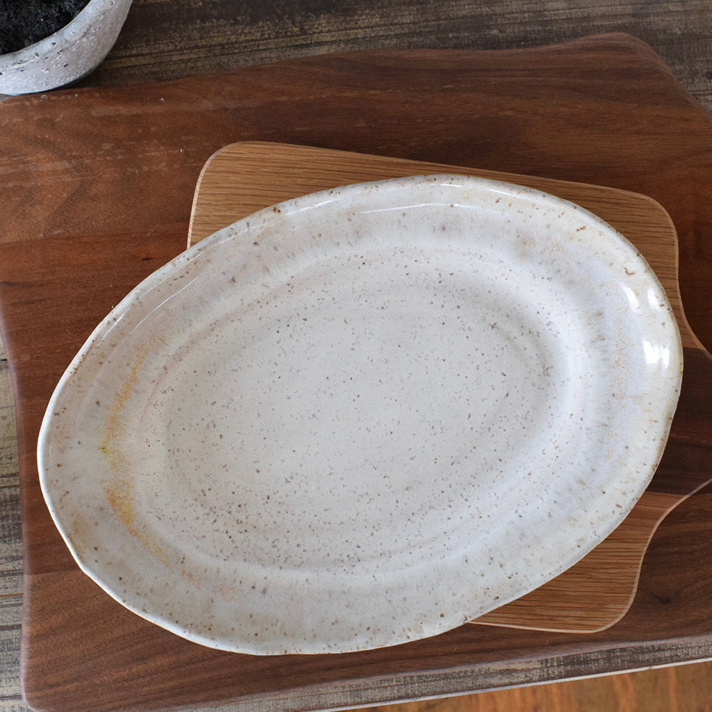 This Small Oval Platter is a great size for serving small side dishes, desserts, or appetizers. We love to use it as a base for the Creamer & Sugar Bowl, too!