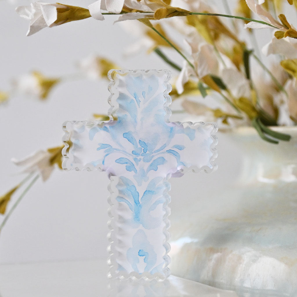 This charming acrylic cross features delicate watercolor detailing in soft blue tones. Measuring 4 inches tall and 3 inches wide, its scalloped edges add an elegant, decorative touch perfect for shelves, desks, or spiritual spaces. A lovely accent piece that brings warmth and grace to any room.
