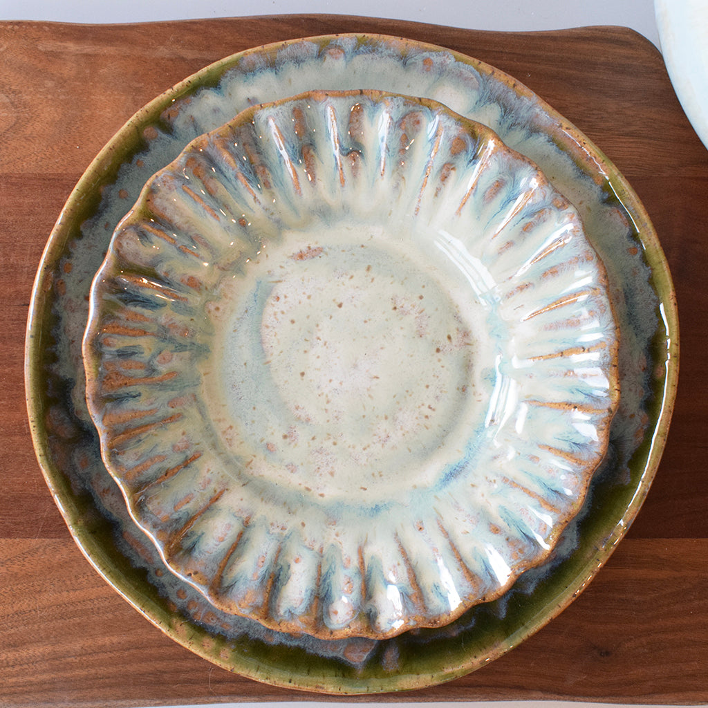 This Seaside glazed salad plate from Etta B is a beautiful and unique addition to any table setting. The hand-painted color palette adds a touch of elegance and sophistication, while the blends of blue & green tones create a warm and inviting atmosphere. The 8" diameter makes it the perfect size for serving a variety of salads, and the plate is also food-safe and dishwasher-safe, making it easy to care for. Whether you're entertaining guests or simply enjoying a meal at home, this salad plate from Etta B is sure to add a touch of beauty and style to your table.