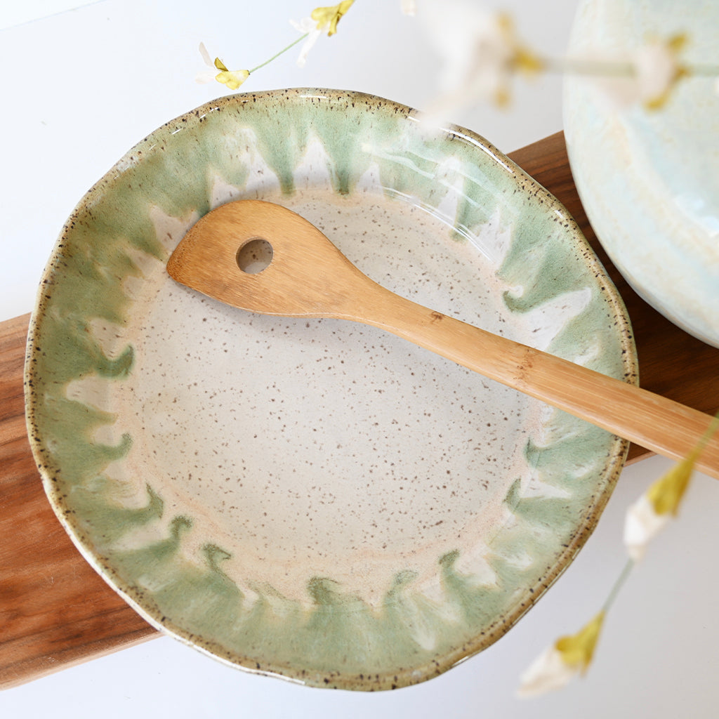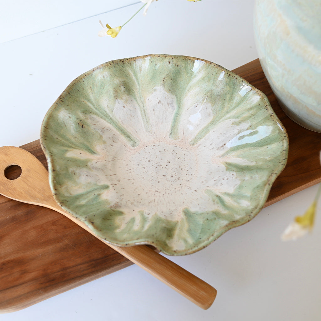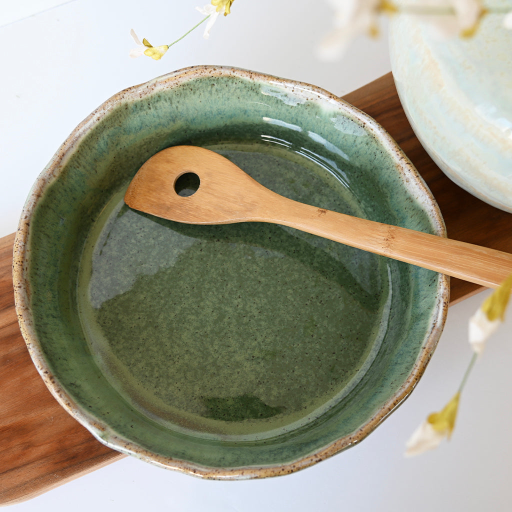 Each unique piece of Etta B Pottery is handcrafted and meticulously hand painted. The Patina and Pear glazes provide a color palate sure to coordinate with any decor. The distressed and antique accents on these exquisite textures makes each piece a treasure. Though similar, no two pieces are just alike.