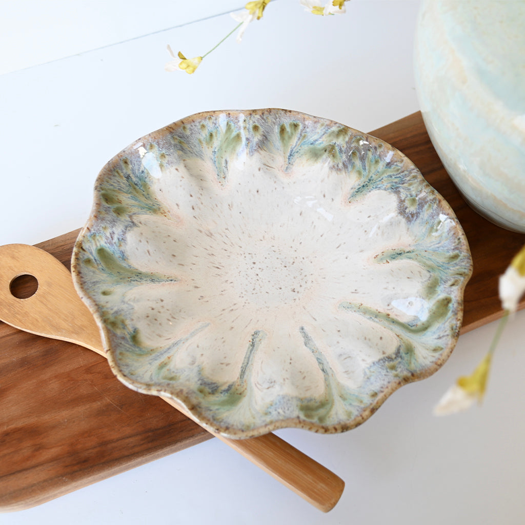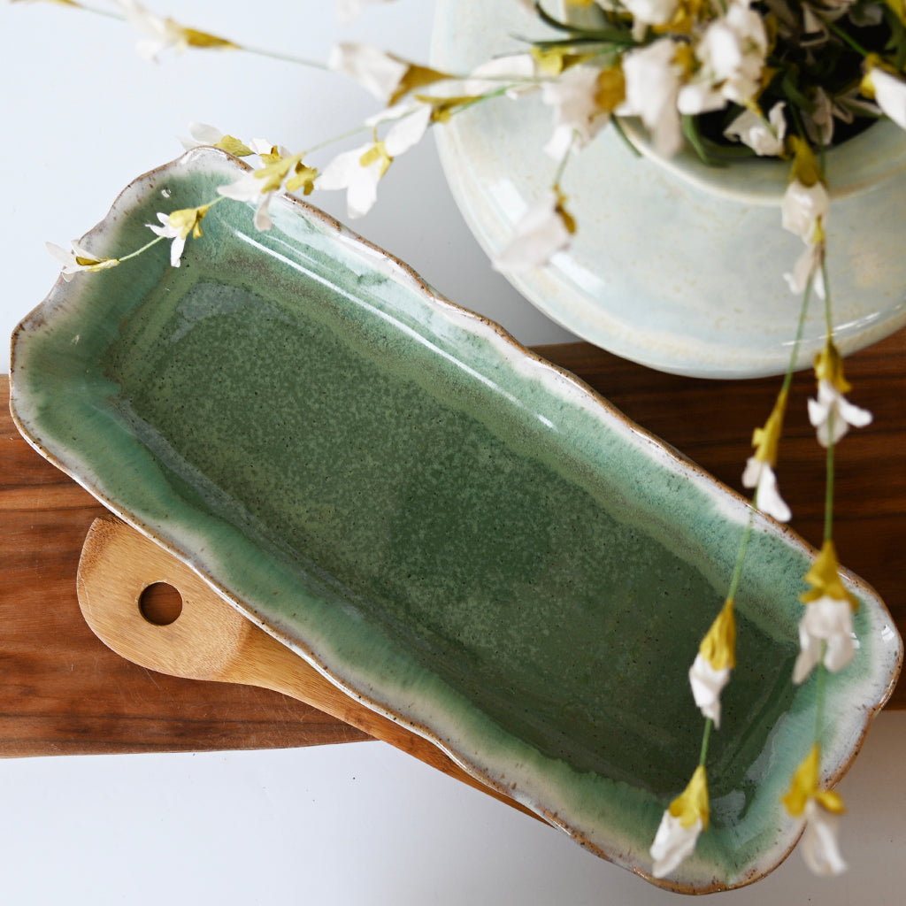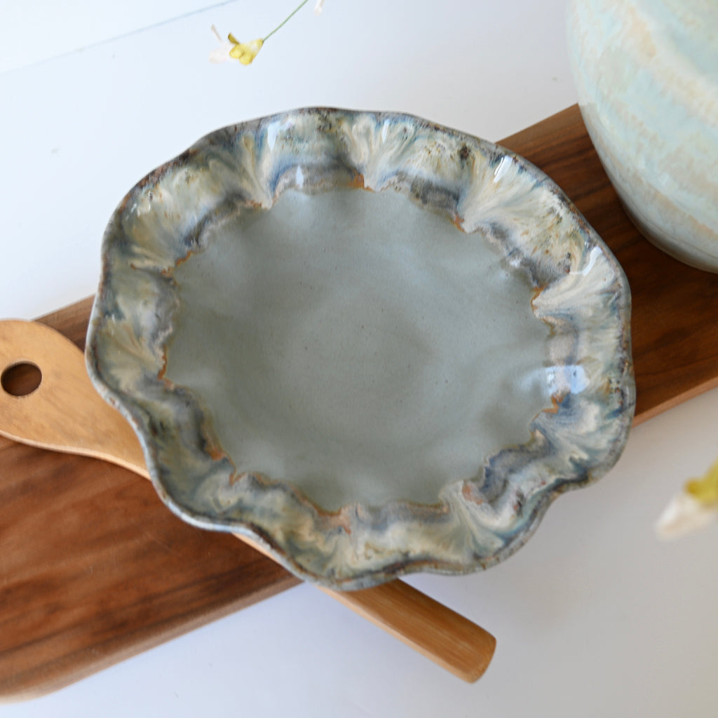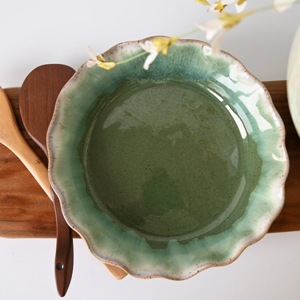 Each unique piece of Etta B Pottery is handcrafted and meticulously hand painted. The Patina and Pear glazes provide a color palate sure to coordinate with any decor. The distressed and antique accents on these exquisite textures makes each piece a treasure. Though similar, no two pieces are just alike.