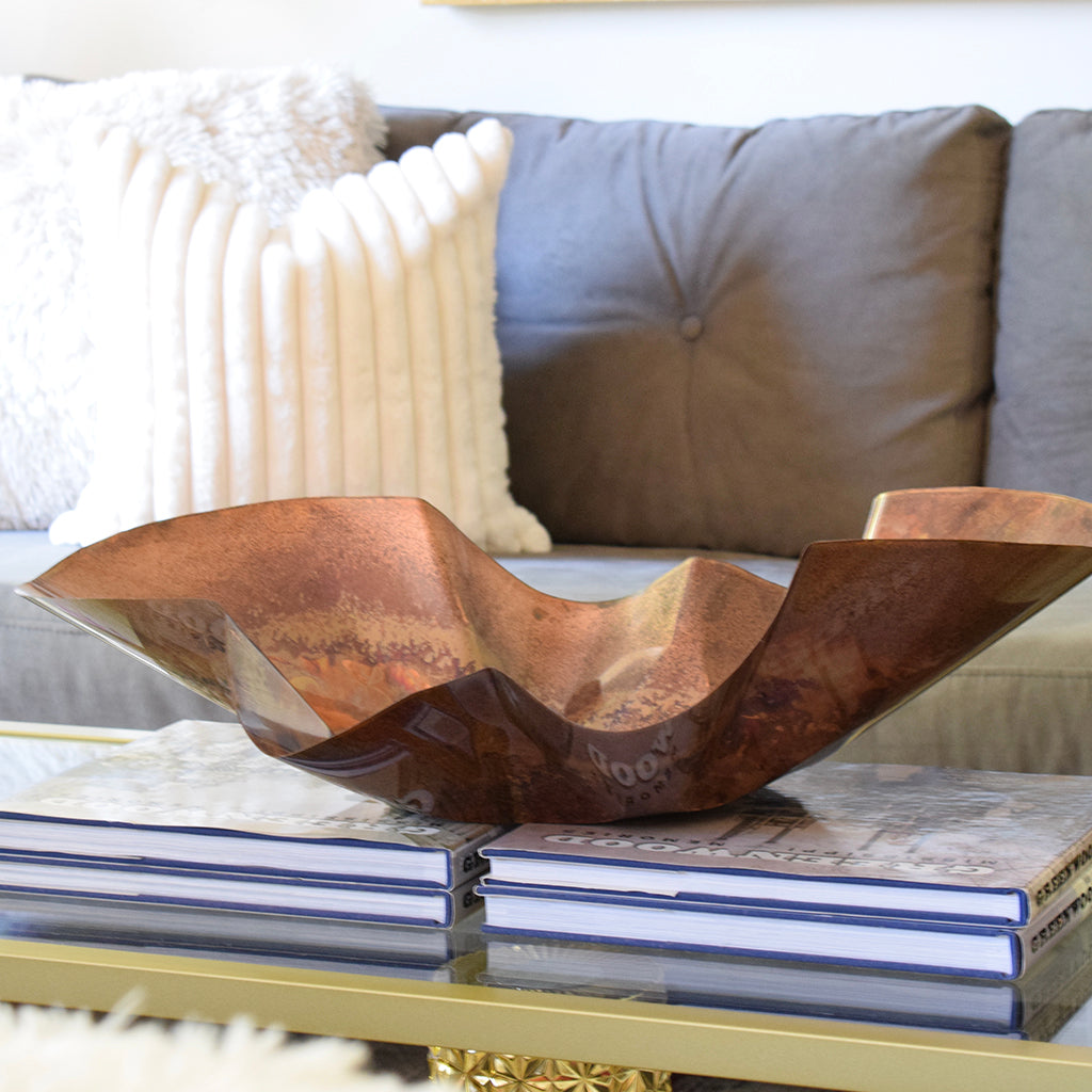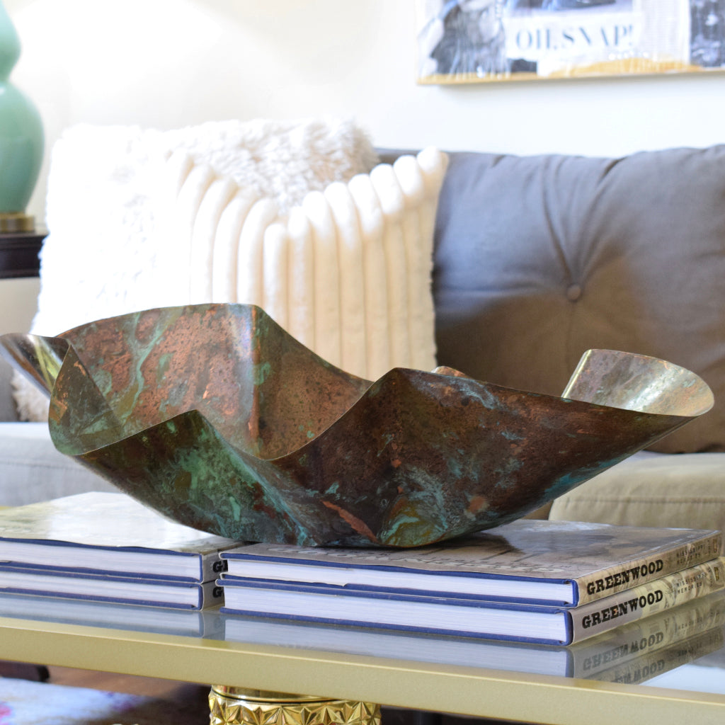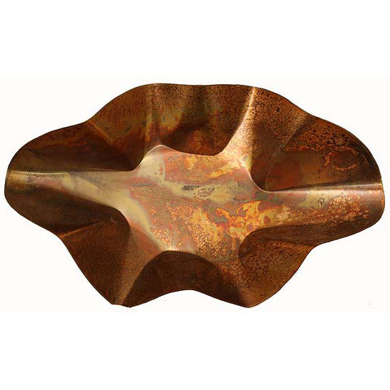 This striking wavy bowl makes a wonderful centerpiece or outdoor accent piece. At its widest point it measures 17" and 5.5" tall. The bowl is available in the classic copper and verdi green finish.