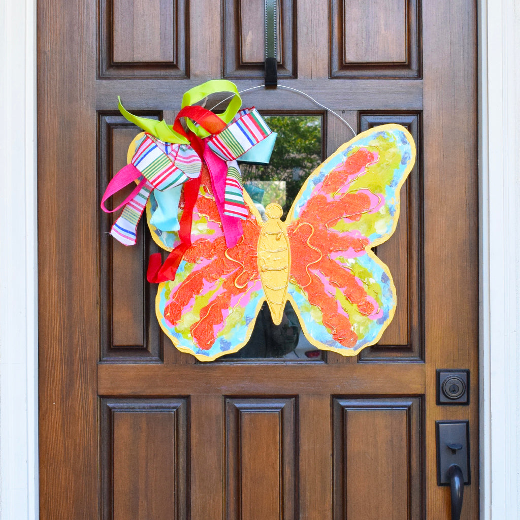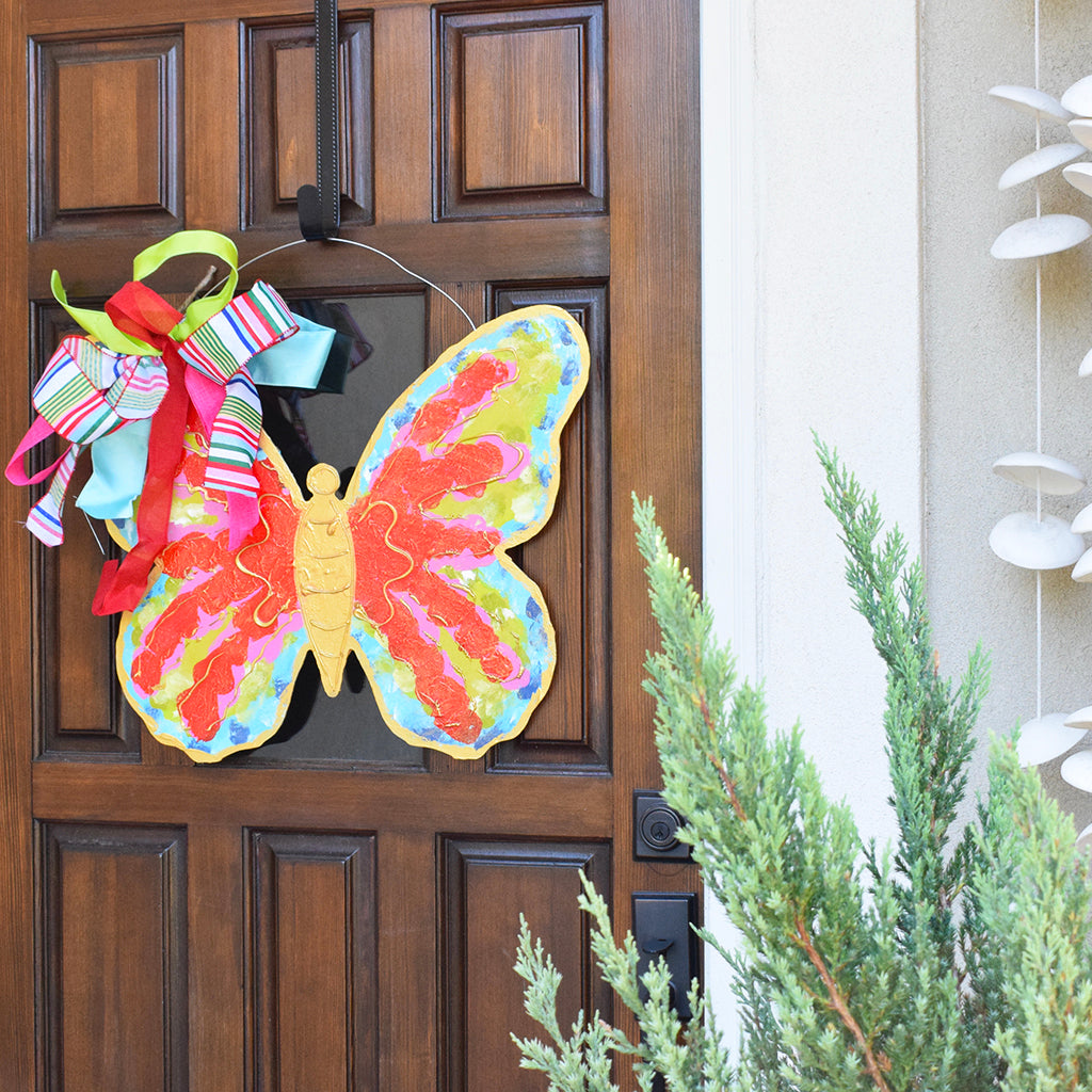 Welcome a whimsical surprise to your door with this Butterfly Door Hanger! Crafted on wood and adorned with a colorful, hand painted butterfly, this eye-catching hanger is ready to fly into any space to spruce it up. Hang it up and transform your door into a wonderland! Measuring 24"x 17", this is one butterfly you don't want to miss out on!