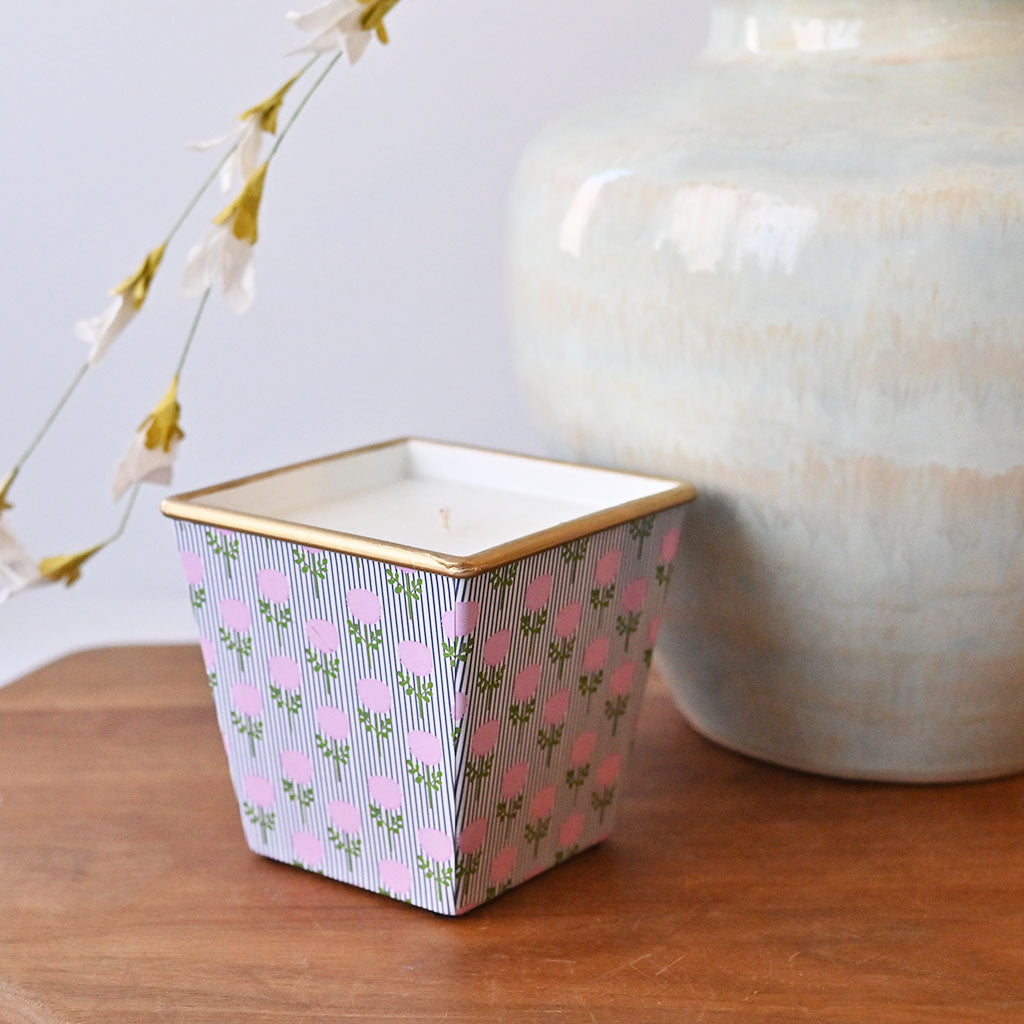These mini cachepot candles are multiuse! When the wax has burned out, upcycle the pot into a planter or anything else you can think of! Hand-poured candles with one pound of wax for a long burn time. Container is 4" both tall and wide and is 3" wide at the base.