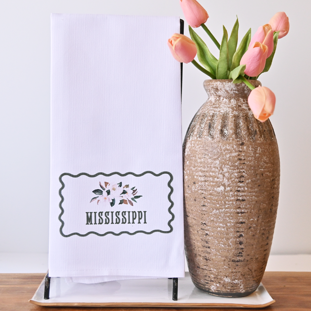 Featuring classic magnolia motifs inspired by Mississippi's natural beauty, this hand towel brings Southern charm to everyday moments. The soft, absorbent fabric is gentle on hands while remaining tough enough for repeated use. Whether displayed on a towel rack or tucked beside your sink, it's both functional and decorative.