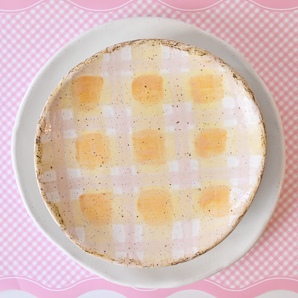 Brighten your table with this charming plaid salad plate, bringing a perfect touch of spring to any meal. Its cheerful yellow tones and classic plaid pattern add warmth and character to your dinnerware collection. At 8 inches in diameter, it's the ideal size for salads, appetizers, or side dishes. A delightful accent piece that celebrates the season with understated elegance.