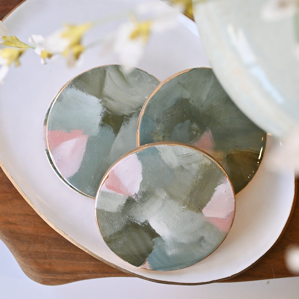 Four coasters per set and comes affixed with felt feet to prohibit scratching surfaces.