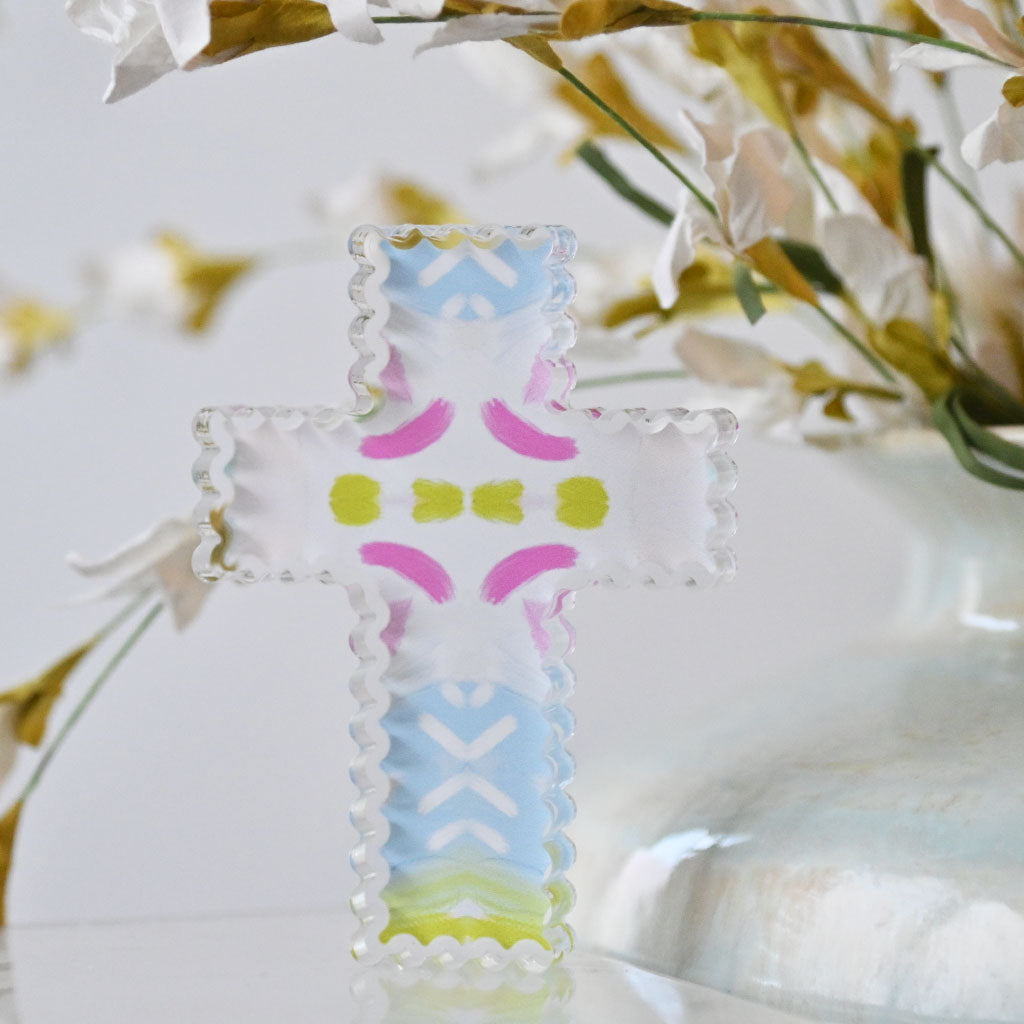 This charming acrylic cross features delicate watercolor detailing in bright colored tones. Measuring 4 inches tall and 3 inches wide, its scalloped edges add an elegant, decorative touch perfect for shelves, desks, or spiritual spaces. A lovely accent piece that brings warmth and grace to any room.