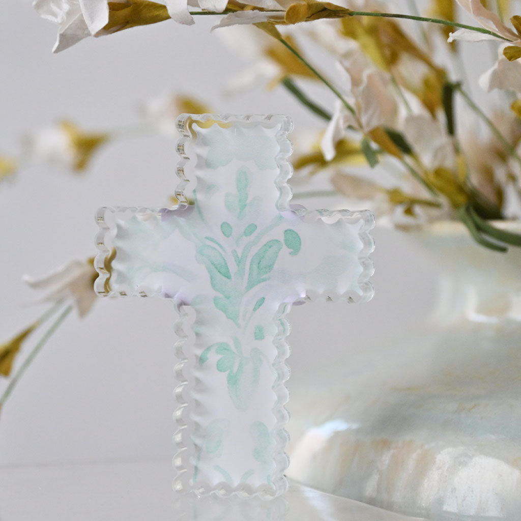 This charming acrylic cross features delicate watercolor detailing in soft green tones. Measuring 4 inches tall and 3 inches wide, its scalloped edges add an elegant, decorative touch perfect for shelves, desks, or spiritual spaces. A lovely accent piece that brings warmth and grace to any room.