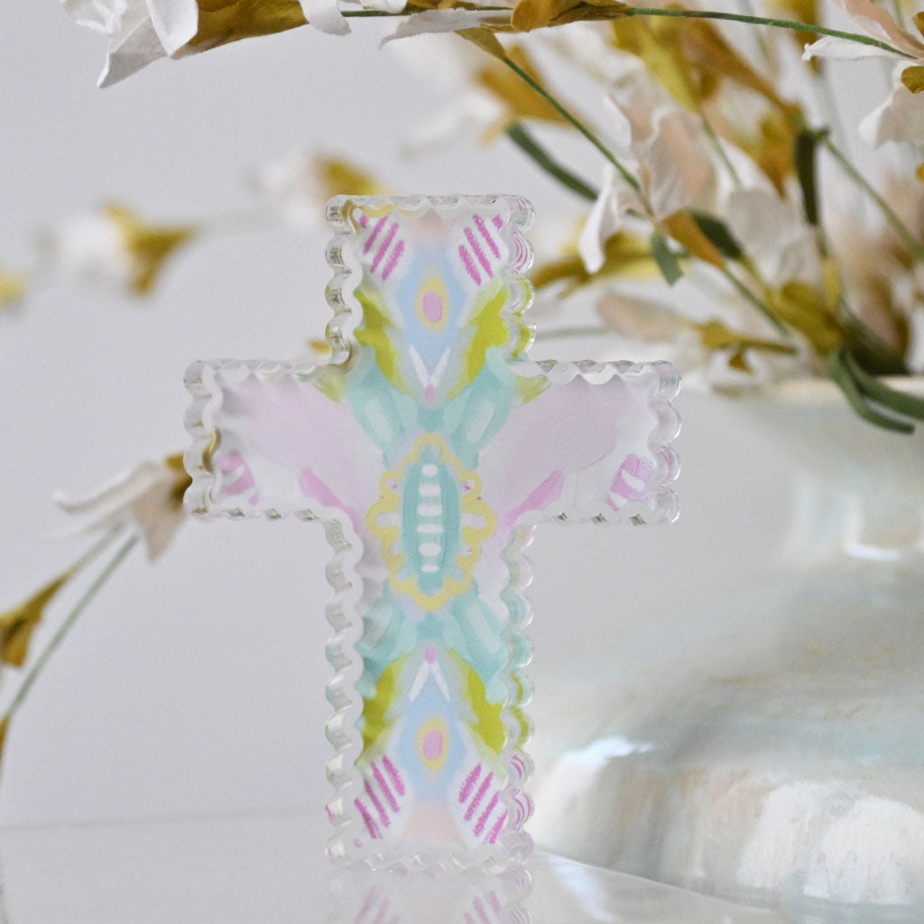 This charming acrylic cross features delicate watercolor detailing in soft pastel tones. Measuring 4 inches tall and 3 inches wide, its scalloped edges add an elegant, decorative touch perfect for shelves, desks, or spiritual spaces. A lovely accent piece that brings warmth and grace to any room.
