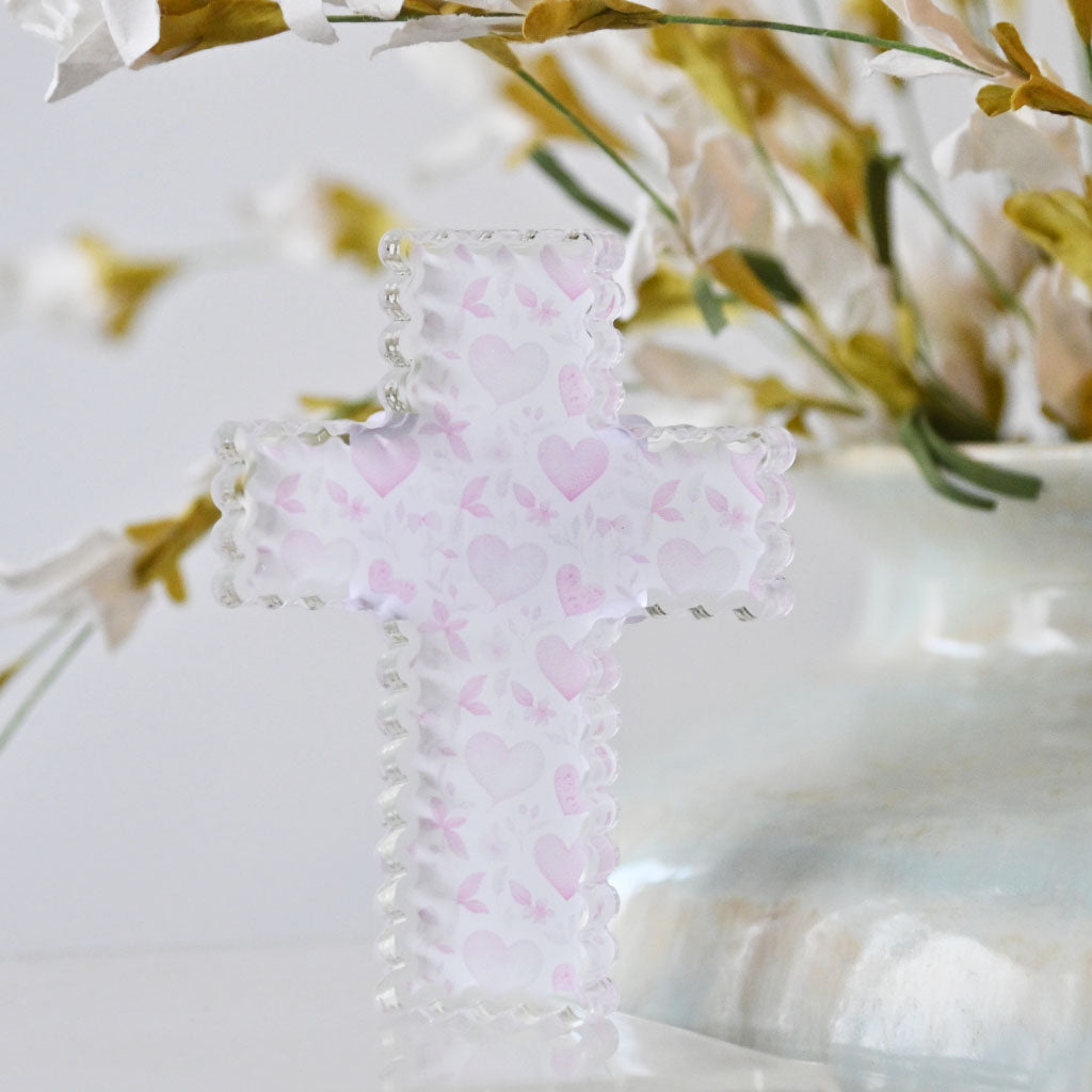 This charming acrylic cross features delicate watercolor detailing in soft pink tones. Measuring 4 inches tall and 3 inches wide, its scalloped edges add an elegant, decorative touch perfect for shelves, desks, or spiritual spaces. A lovely accent piece that brings warmth and grace to any room.