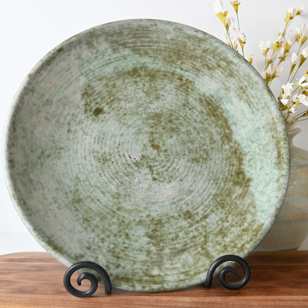 The rich earth tones of the Mississippi Delta are captured in the glazes and textures of this pottery, crafted with care by the Woods Brothers of Mound Bayou, MS. This piece measures 16 inches in diameter.