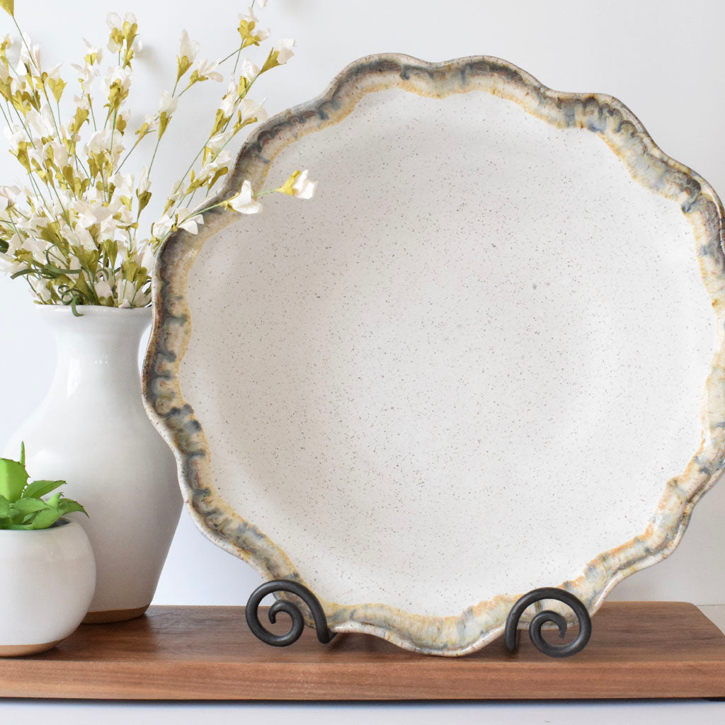 Each unique piece of Etta B Pottery is handcrafted and meticulously hand painted. The beautiful glazes provide a color palate sure to coordinate with any décor. The distressed and antique accents on these exquisite textures makes each piece a treasure. Though similar, no two pieces are just alike. Measures 17"x 4".