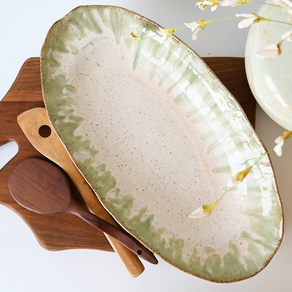 Introducing the Long Oval Dish in the charming Matcha glaze. This beautiful and functional dish is perfect for serving hors d'oeuvres, appetizers, or as a decorative piece in your home. With its elongated oval shape, it adds an elegant touch to any occasion.