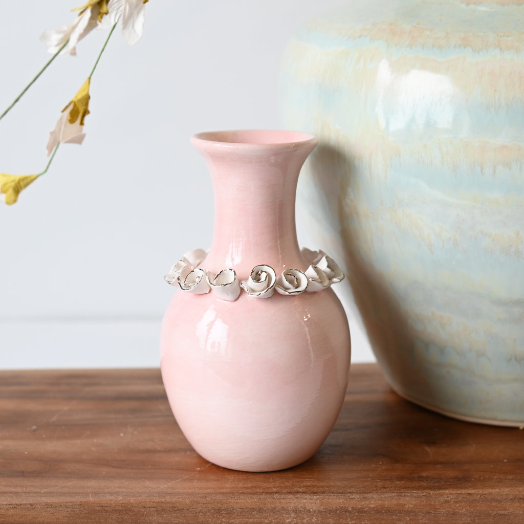 Introducing the exquisite Floral Bud Vase in delicate pink. This hand painted masterpiece stands at 5.5" tall, adding a touch of elegance to any room. Bring the beauty of nature indoors with this luxurious piece, perfect for displaying your favorite blooms.
