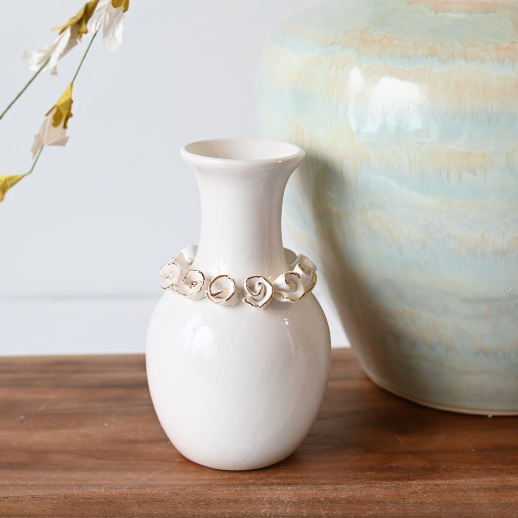 Introducing the exquisite Floral Bud Vase in a simple white glaze. This hand painted masterpiece stands at 5.5" tall, adding a touch of elegance to any room. Bring the beauty of nature indoors with this luxurious piece, perfect for displaying your favorite blooms.