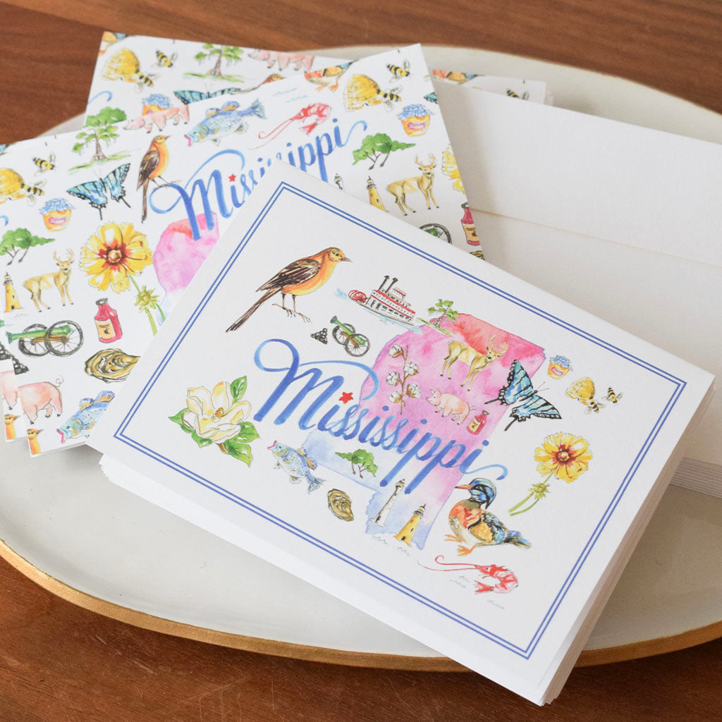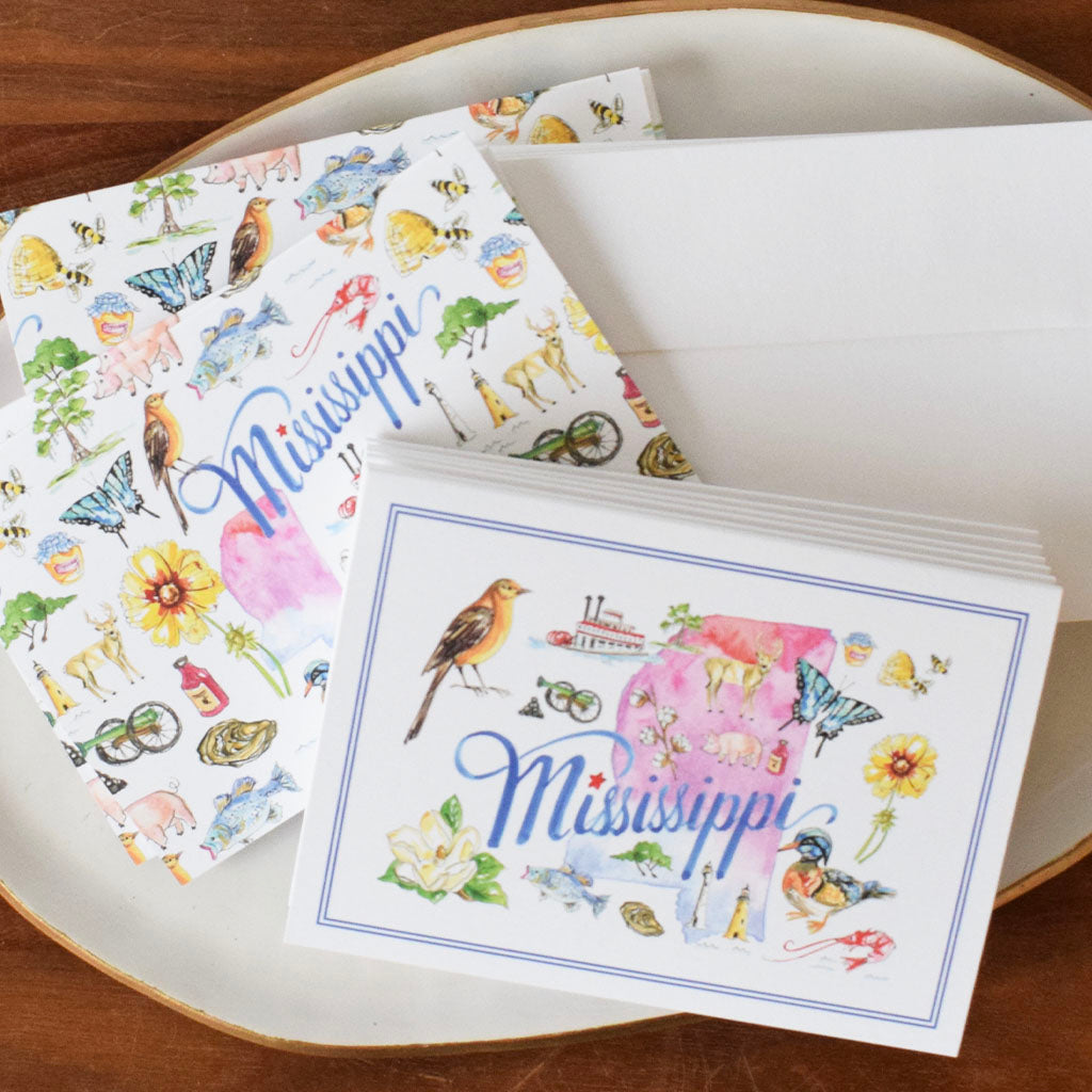 Spread the joy of Mississippi with our Mississippi Icons Notecards Set! Featuring two unique designs, these cards are perfect for sending greetings and well wishes to your loved ones. Each set includes 6 cards and envelopes, making it easy to share a piece of Mississippi with others.