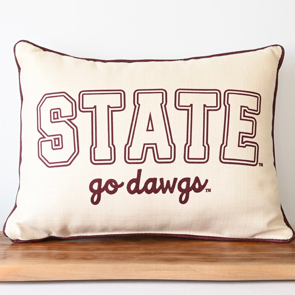Get ready to cheer on your favorite team with the Mississippi State Varsity Rectangle Pillow. Made for true fans, this pillow proudly displays STATE in large letters, making it the perfect addition to any game day celebration. Show your team spirit and support in style with this quirky and playful pillow! Not recommended for full outdoor use. Rectangle pillows measure approximately 18"x 14".