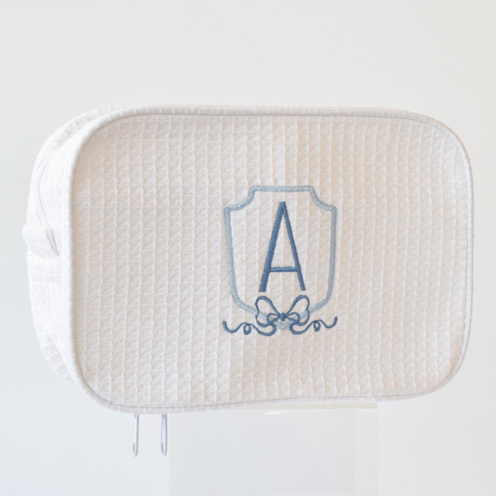 Indulge in convenience with our Waffle Weave Initial Cosmetic Bag! Crafted with a soft waffle weave material and embroidered with your initial in a dual toned blue design, this cosmetic bag is the perfect travel companion. Keep your essentials organized while adding a sweet personal touch!
