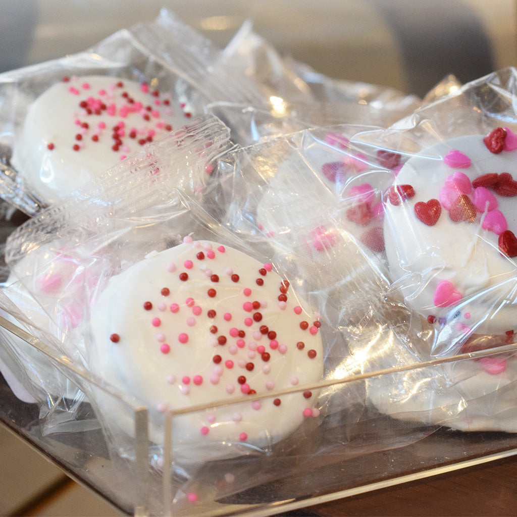 Oreo hand dipped with white chocolate and sprinkled with holiday sprinkles for a festive snack. Makes a great addition to a basket!