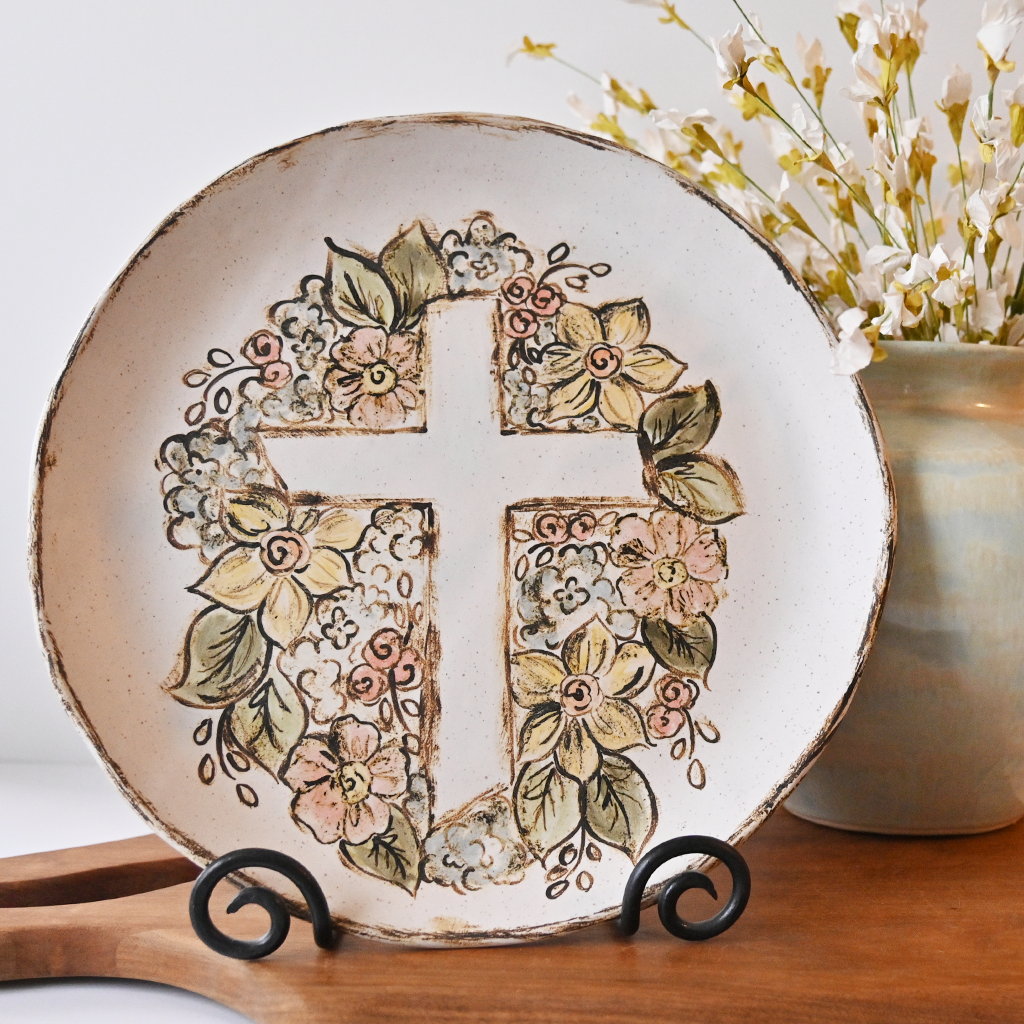 A stunning decorative platter featuring an elegant cross design beautifully framed by vibrant florals. This 13-inch piece brings warmth and spiritual charm to any room, making it perfect for display on shelves, walls, or as a meaningful gift. The intricate floral detailing adds a touch of natural beauty while the cross serves as a timeless symbol of faith and grace.