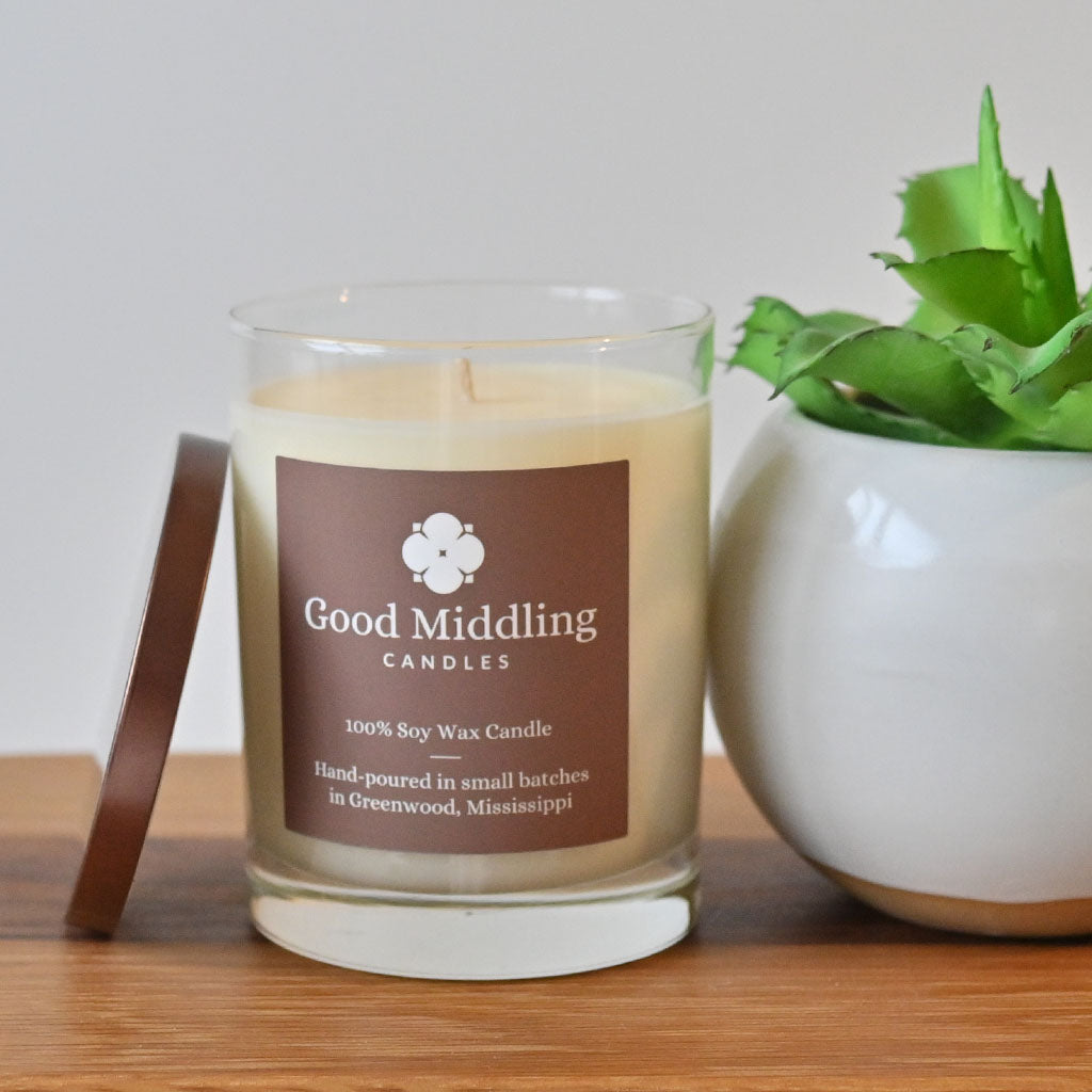 Discover Good Middling Candles, crafted right here in Greenwood, MS with a whole lot of heart. Each hand-poured 10.5 oz. candle sits pretty in a double old fashioned glass—because why waste a good vessel? Made from 100% soy wax and blended with thoughtfully selected fragrance oils, these small-batch beauties deliver the perfect scent every single time. Once the wax is gone, repurpose your glass however your heart desires. It's a candle and a gift in one! Each candle comes with a lid to keep your candle nice and pristine. Each candle has a burn life of around 75 hours.