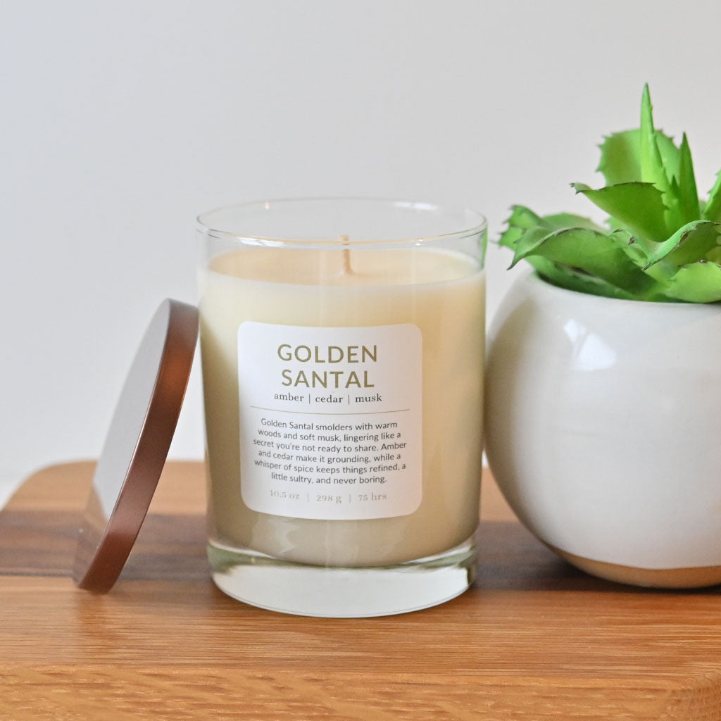 Golden Santal: Amber, Cedar, Musk. Golden Santal smolders with warm woods and soft musk, lingering like a secret you're not ready to share. Amber and cedar make it grounding, while a whisper of spice keeps things refined, a little sultry, and never boring.