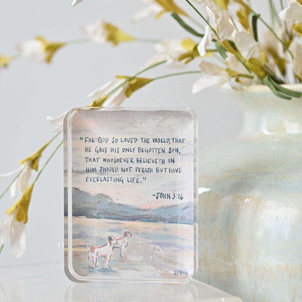 These acrylic scripture blocks feature meaningful Bible verses paired with Lauren’s artwork, created as small reminders of encouragement and faith for everyday life. Each block is printed on acrylic, cut to shape, and designed to stand on its own — easy to display on a desk, shelf, or bedside table.