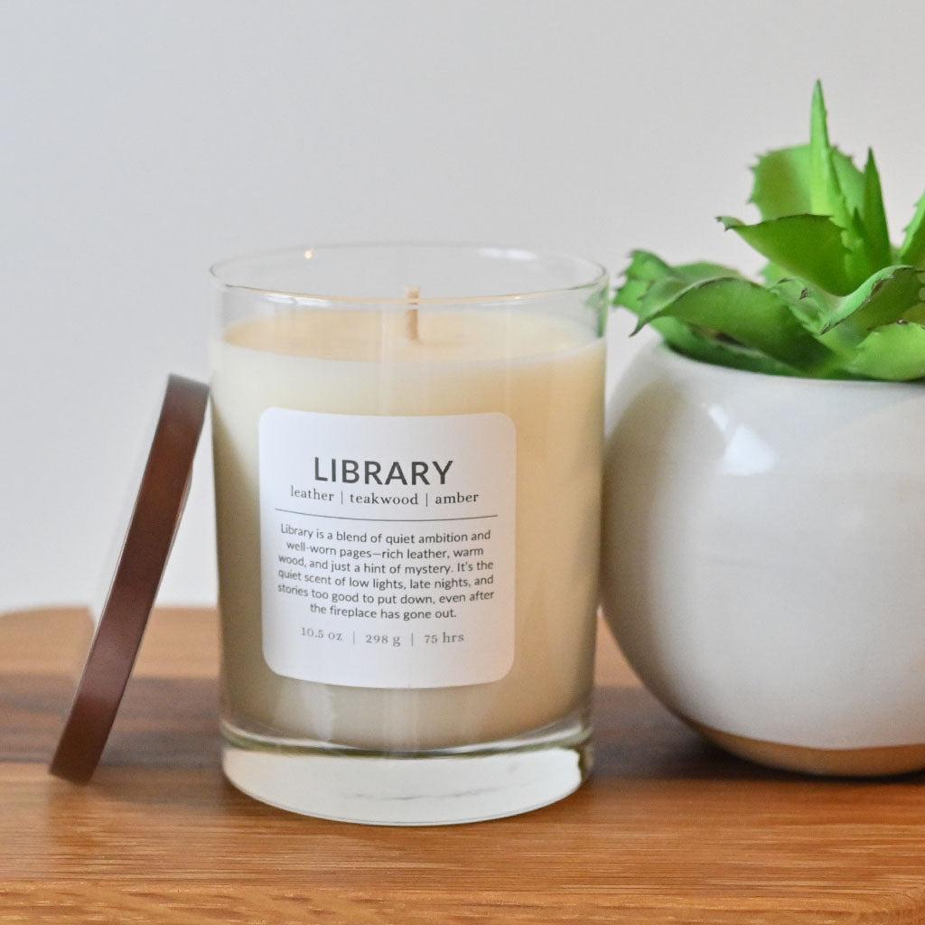 Library- a blend of leather, teakwood, and amber. Library is a blend of quiet ambition and well-worn pages- rich leather, warm wood and just a hint of mystery. It's the quiet scent of low lights, late nights, and stories too good to put down, even after the fireplace has gone out.