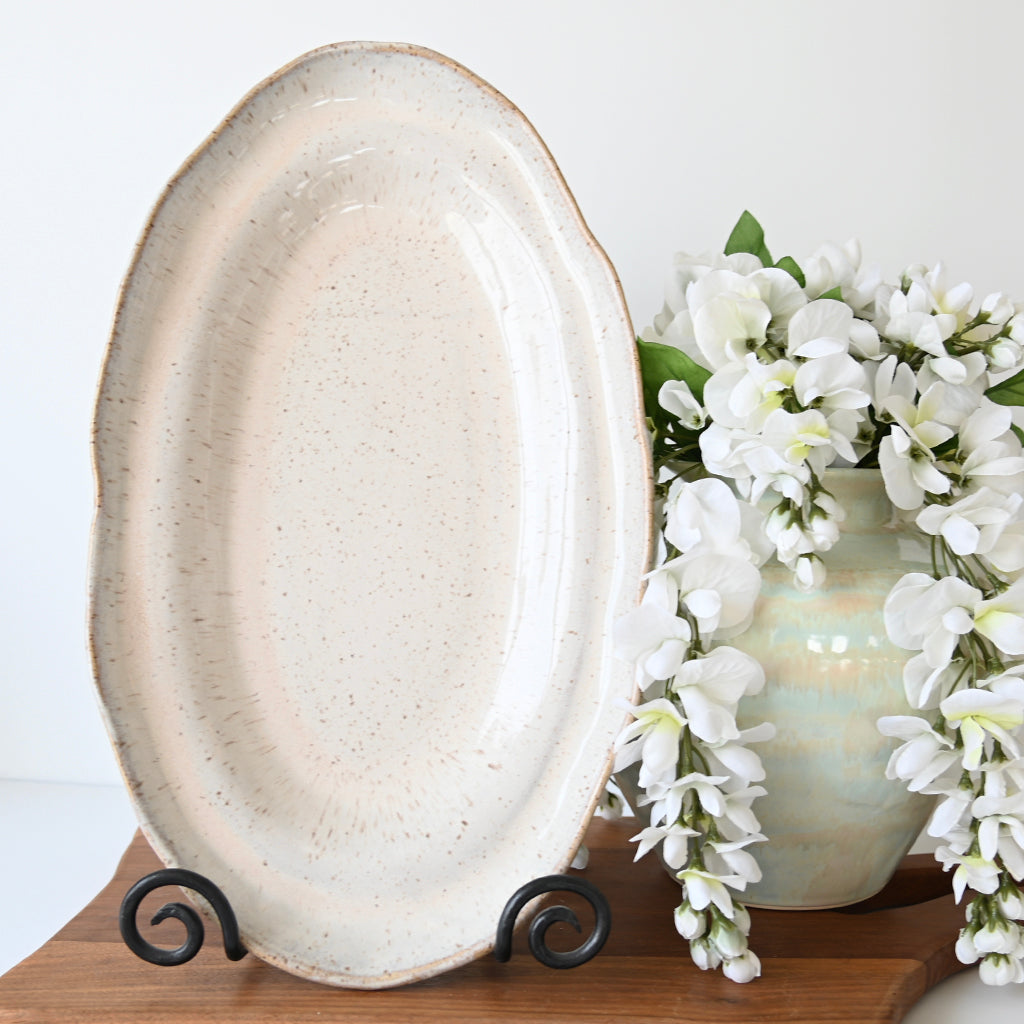 Introducing the Long Oval Dish in the charming Chantilly Cream glaze. This beautiful and functional dish is perfect for serving hors d'oeuvres, appetizers, or as a decorative piece in your home. With its elongated oval shape, it adds an elegant touch to any occasion.