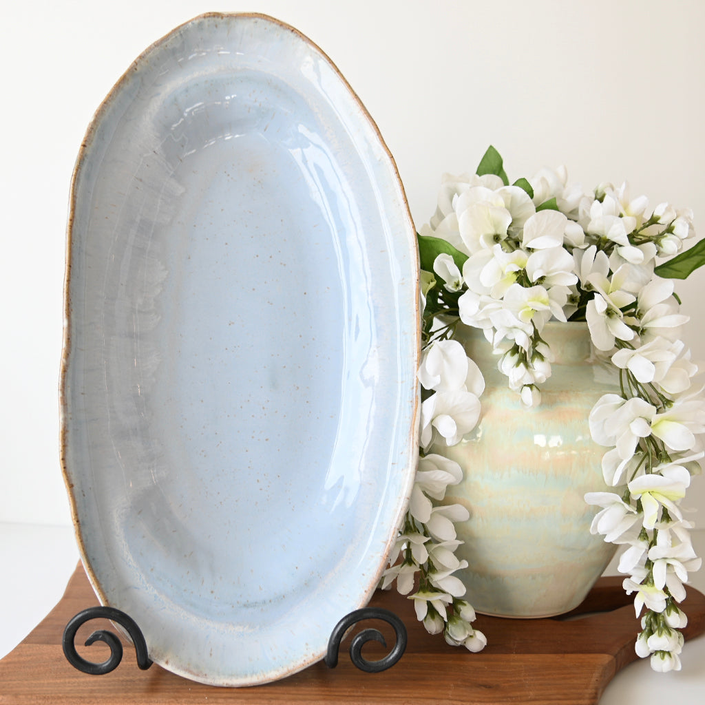 Introducing the Long Oval Dish in the beautiful Wisteria glaze. This beautiful and functional dish is perfect for serving hors d'oeuvres, appetizers, or as a decorative piece in your home. With its elongated oval shape, it adds an elegant touch to any occasion.