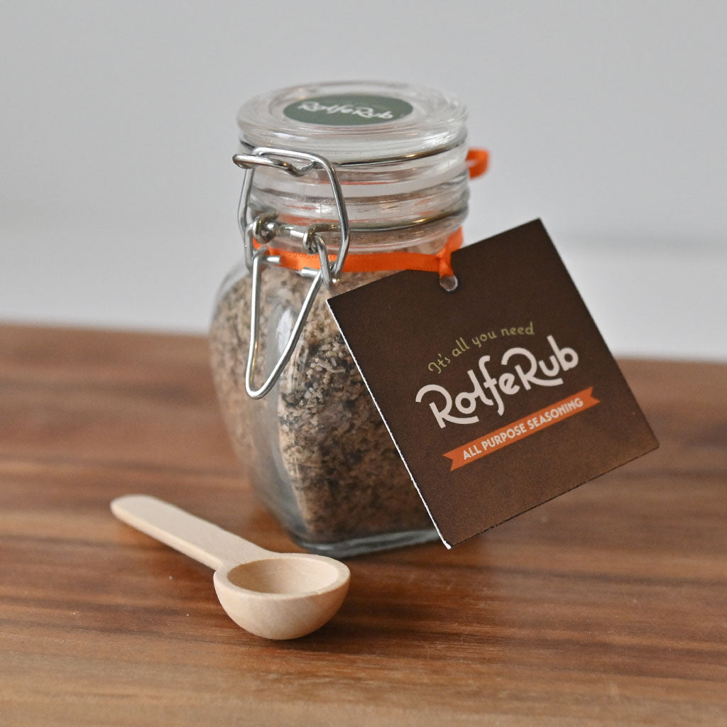 Looking for the perfect all purpose seasoning? Look no further! Rolfe Rub is a perfect blend of spices that was thoughtfully crafted to replace your salt & pepper. The 4 oz. glass jar is designed for easy use and keeps your favorite seasoning fresh. It even has a little bamboo spoon. Perfect for stocking your kitchen & ready to enhance any meal or occasion! The flavors are great on meat, seafood, fish, veggies, & more - the options are endless with this pantry essential!