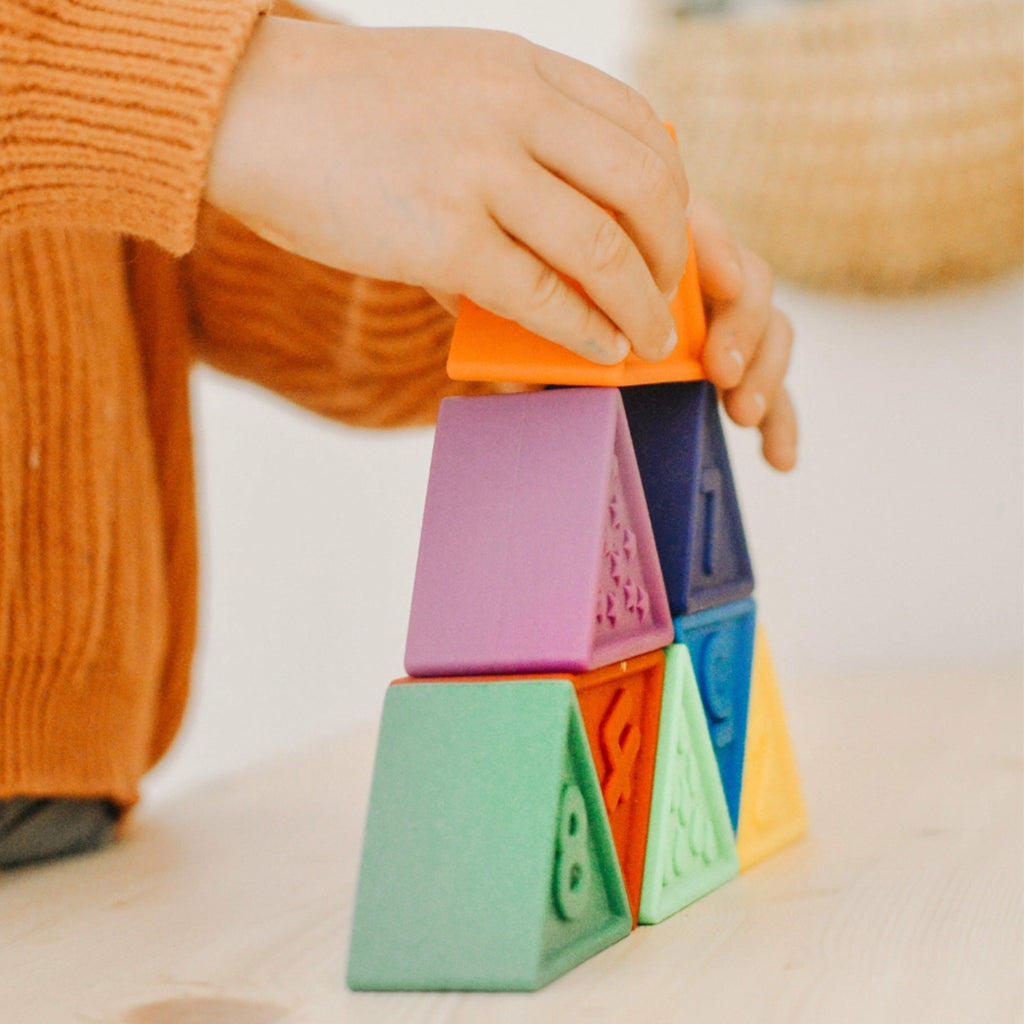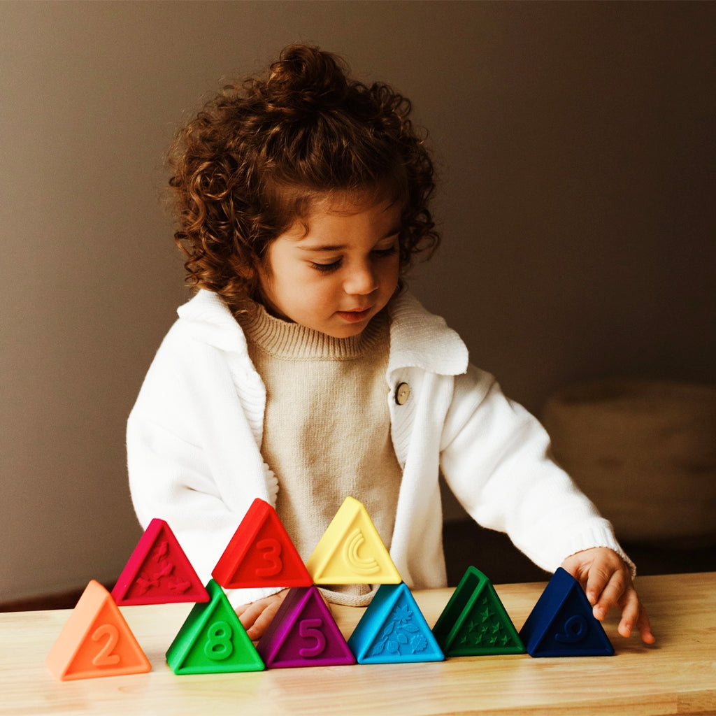 Build, stack, learn! These sensory blocks contain 9 triangle blocks made from toxic-free silicone that little ones can use to build, stack, and learn. Perfect for open-ended play, each colorful block features a number and corresponding illustration on the other side for added learning opportunities. From the founders of Glo Pals, Triblox is an excellent way for little ones to channel their own creativity and direct their own play!