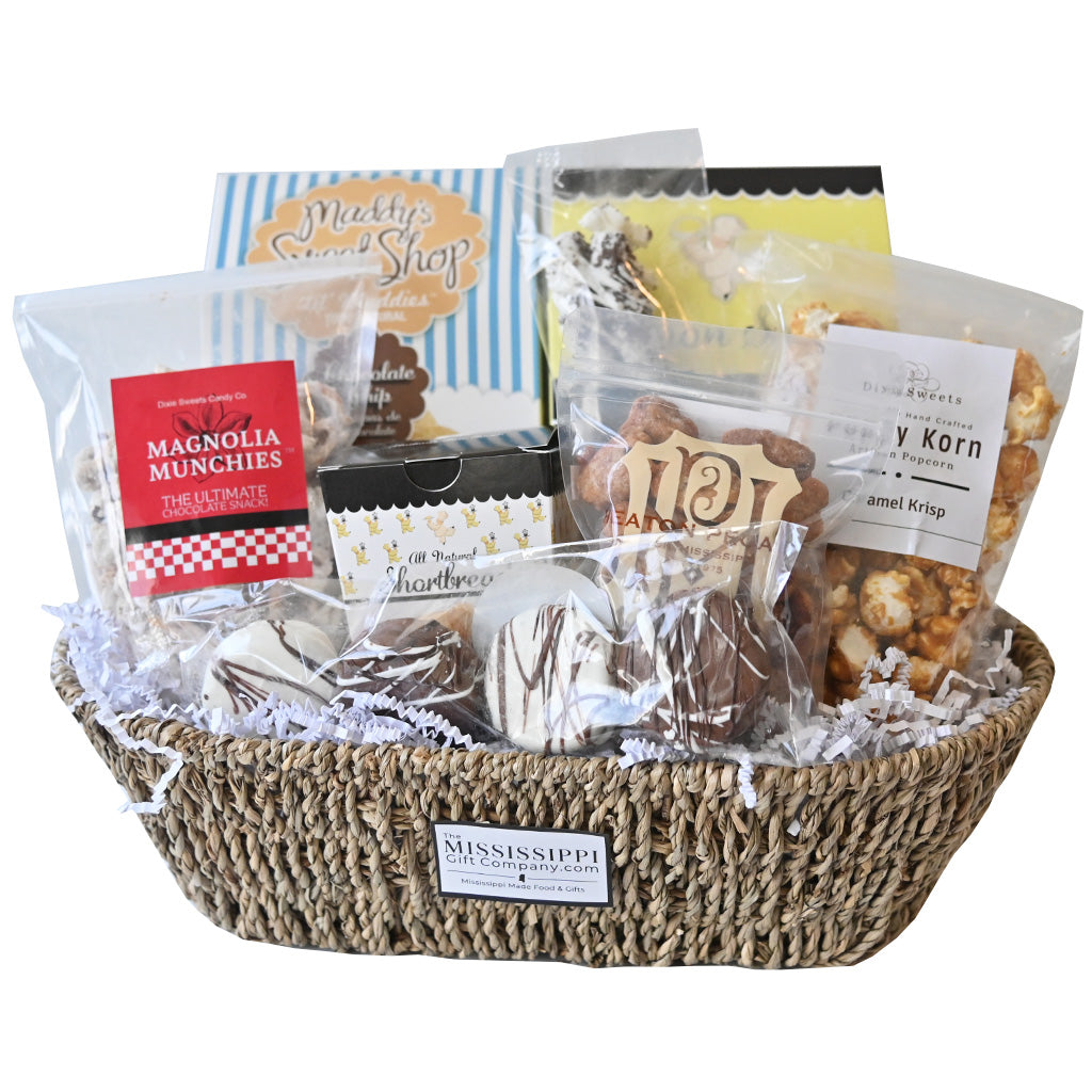 Know someone with a sweet tooth? Everything in this basket will be sure to please them! This basket contains our favorite sweet treats and are all sharable. Great for an office or family!