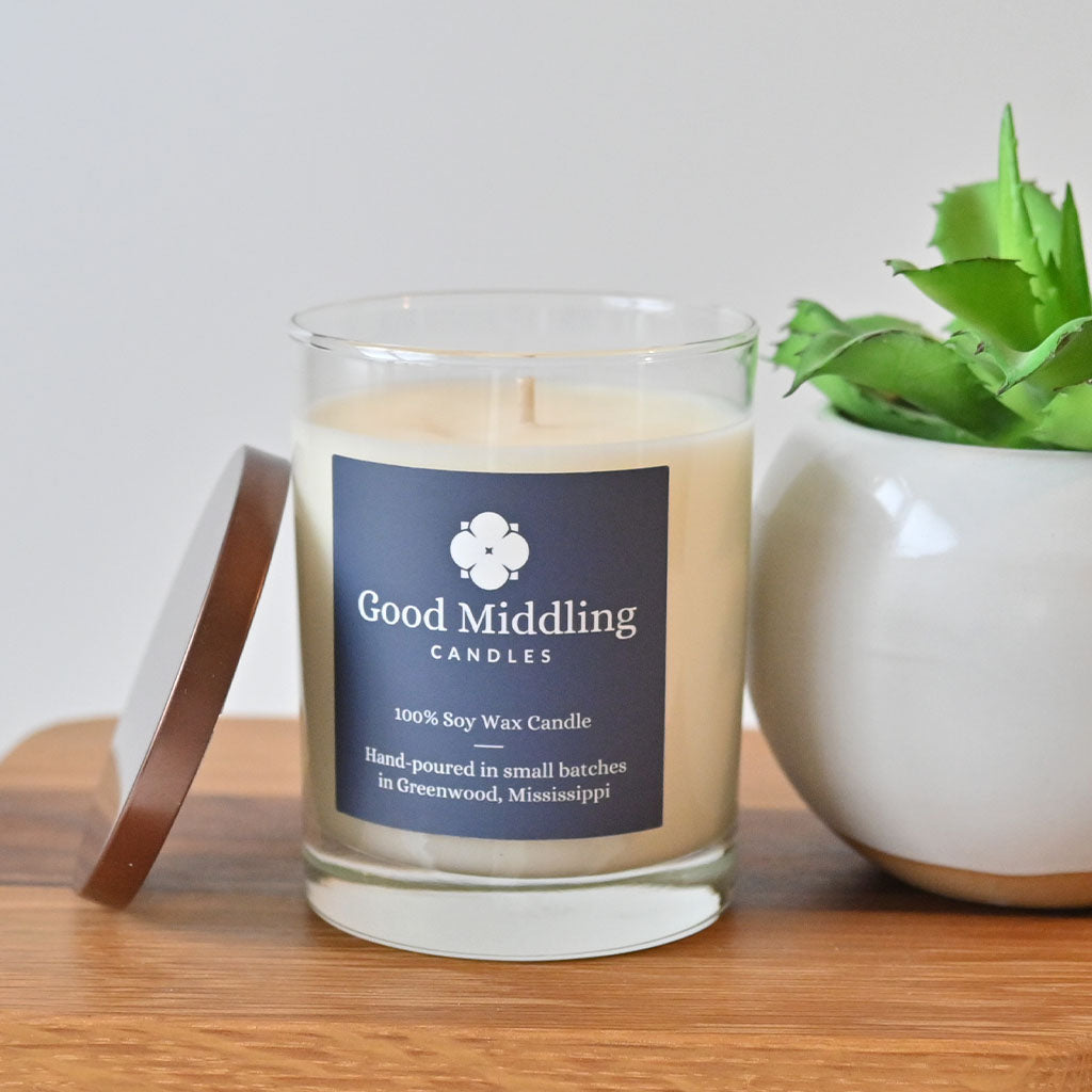 Discover Good Middling Candles, crafted right here in Greenwood, MS with a whole lot of heart. Each hand-poured 10.5 oz. candle sits pretty in a double old fashioned glass—because why waste a good vessel? Made from 100% soy wax and blended with thoughtfully selected fragrance oils, these small-batch beauties deliver the perfect scent every single time. Once the wax is gone, repurpose your glass however your heart desires. It's a candle and a gift in one! Each candle comes with a lid to keep your candle nice and pristine. Each candle has a burn life of around 75 hours.