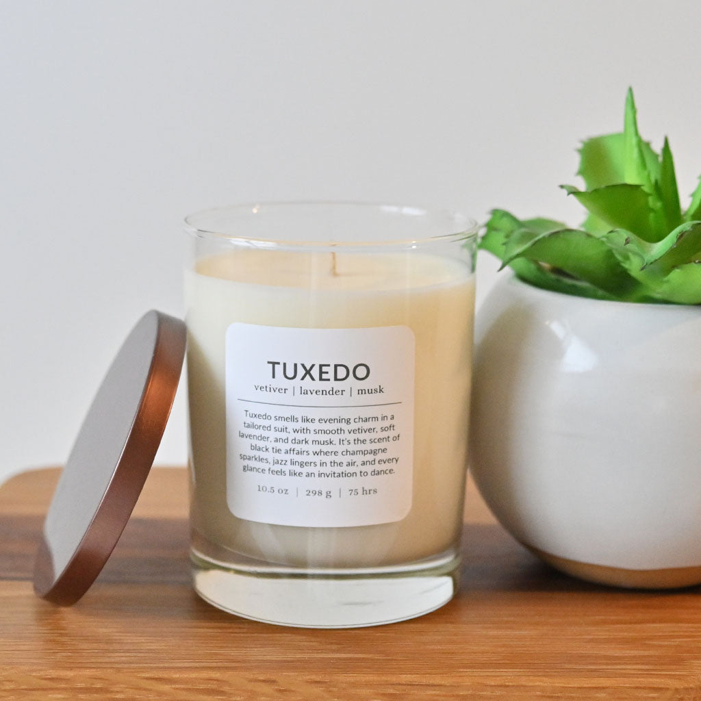 Tuxedo Candle: Vetiver, Lavender, and Musk. Tuxedo smells like evening charm in a tailored suit, with smooth vetiver, soft lavender, and dark musk. It's the scent of the black tie affairs where champagne sparkles, jazz lingers in the air, and every glance feels like an invitation to dance.