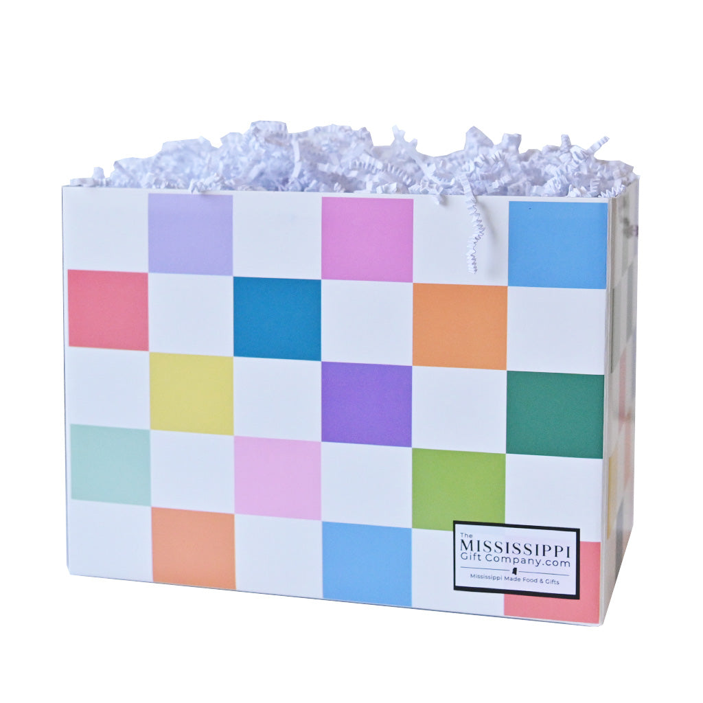 Add a touch of whimsy with this charming and lively color block box, perfect for stuffing with their favorite treats. It can hold around 6-8 goodies, depending on their size.