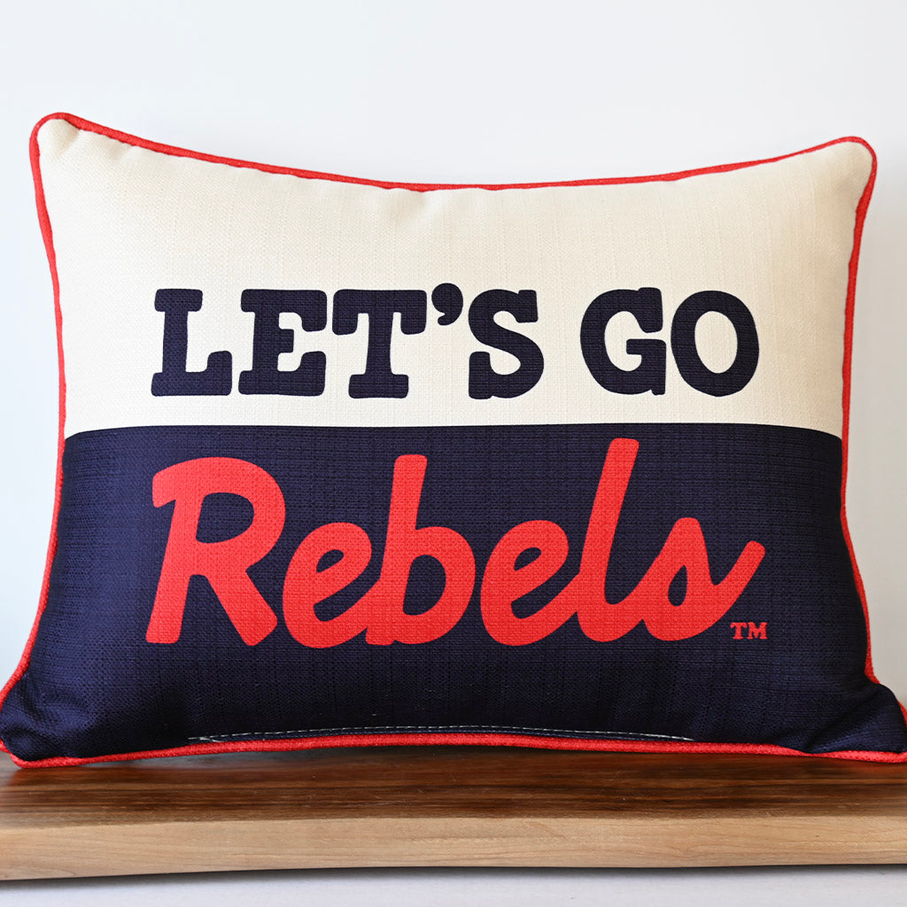 Get ready to cheer on the Ole Miss Rebels with this Let's Go Rebels rectangle pillow! Perfect for any fan of the rebs, this quirky and fun pillow will add a touch of team spirit to your home. Go Rebels!