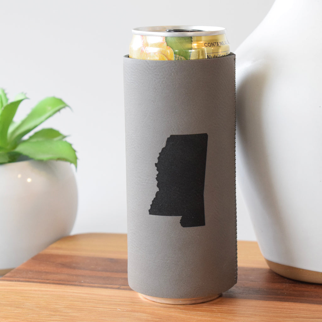 Tailgate in style with this premium leather coolie. Adorned with a silhouette of Mississippi, you'll be the envy of all of your friends. Fits a slim sized can. Stay cool and stylish at your next tailgate with this Mississippi Leather Slim Can Coolie. Made from premium leather and featuring a sleek silhouette of the state, it's sure to make you stand out from the crowd. Plus, it's designed to fit slim sized cans, making it the perfect accessory for any outdoor event. Don't settle for a boring, plain coolie - elevate your drink game with this must-have item!